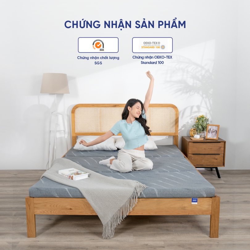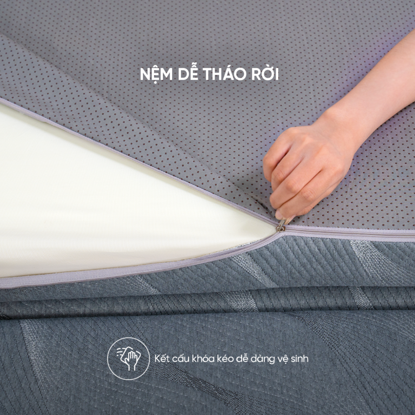 Áo nệm bên trong là vải thun với độ co giãn tốt để thông khí và bảo vệ lõi PU Foam. Vải ga ngoài Polyester dày dặn với lớp bông chần sát khuẩn được xử lý bằng công nghệ ép nhiệt, cho khả năng chống bụi khuẩn, thấm hút mồ hôi và bền bỉ tối ưu