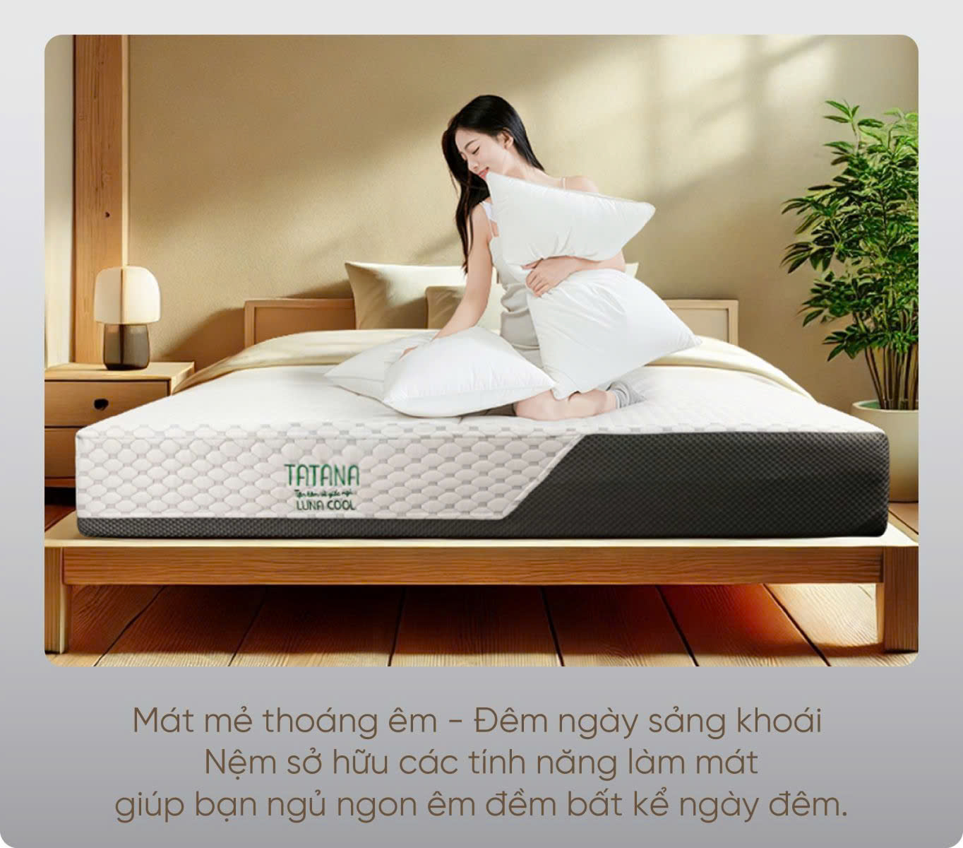 Chúng tôi vận chuyển miễn phí NỘI THÀNH các khu vực: Tp.HCM ( trừ Cần Giờ), Nội thành các quận Tp.Hà Nội. Đồng Nai (Tp. Biên Hòa, Long Thành ), Bình Dương ( Dĩ An, Thuận An, Thủ Dầu Một), Tp. Cần Thơ, An Giang(Tp. Long Xuyên), Vũng Tàu(Tp. Vũng Tàu, TP Bà Rịa Vũng Tàu) và Đắk Lắk (Tp.Buôn Ma Thuột), Bình Phước (Tp Đồng Xoài) Khánh Hòa (Tp. Nha Trang) , Kiên Giang (Tp. Rạch Giá) , Bình Thuận (Tp. Phan Thiết), Tp. Đà Nẵng. - Hỗ trợ 50% phí vận chuyển ở các khu vực tỉnh khác. - Anh/Chị vui lòng liên hệ shop để được hỗ trợ chi tiết. Nệm Luna Cool Tatana là dòng nệm có độ đàn hồi cao, giúp nâng đỡ trọn vẹn các đường cong cơ thể. Nệm Luna Cool được trang bị thêm lớp Gel Memory Foam xanh giúp