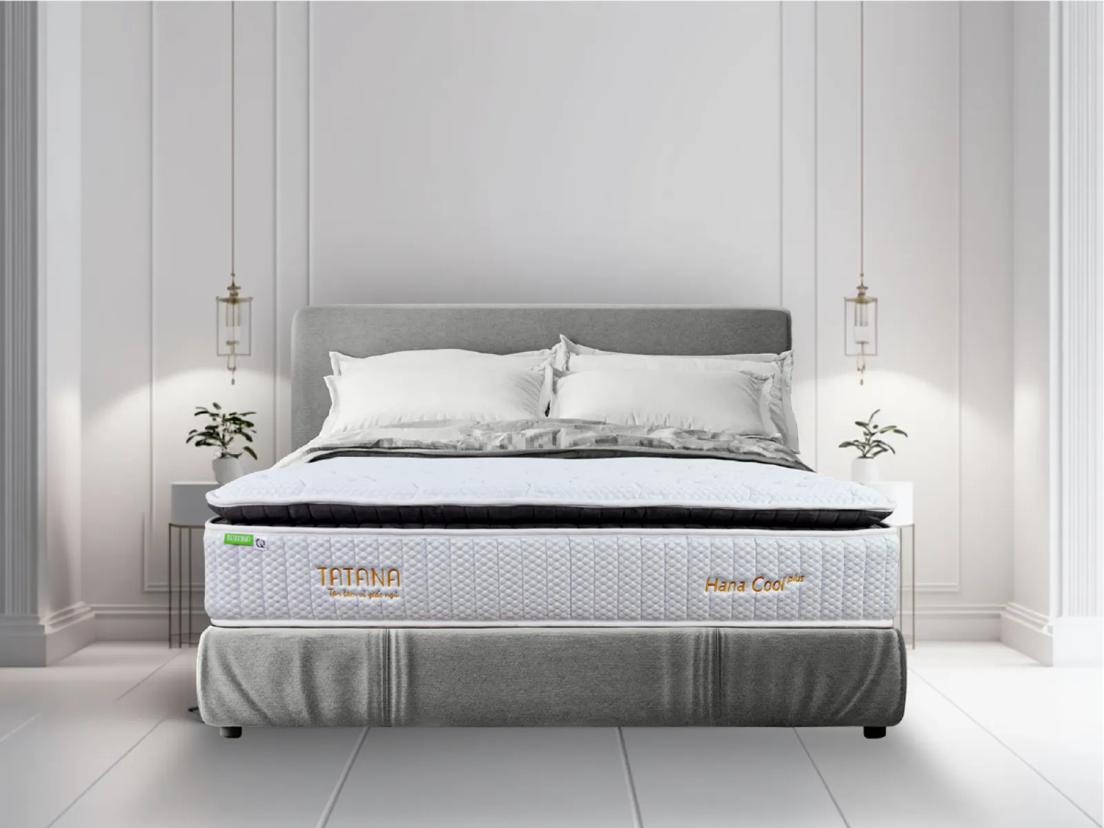 - Độ dày nệm Nệm có độ cao 30cm chuẩn quốc tế nâng đỡ và chịu lực tốt. Độ cao phù hợp giúp cho bạn di chuyển lên xuống dễ dàng hơn, đồng thời tăng thêm tính thẩm mỹ, tinh tế cho cả căn phòng. Đặc điểm của nệm lò xo túi Tatana Hana Cool Plus
