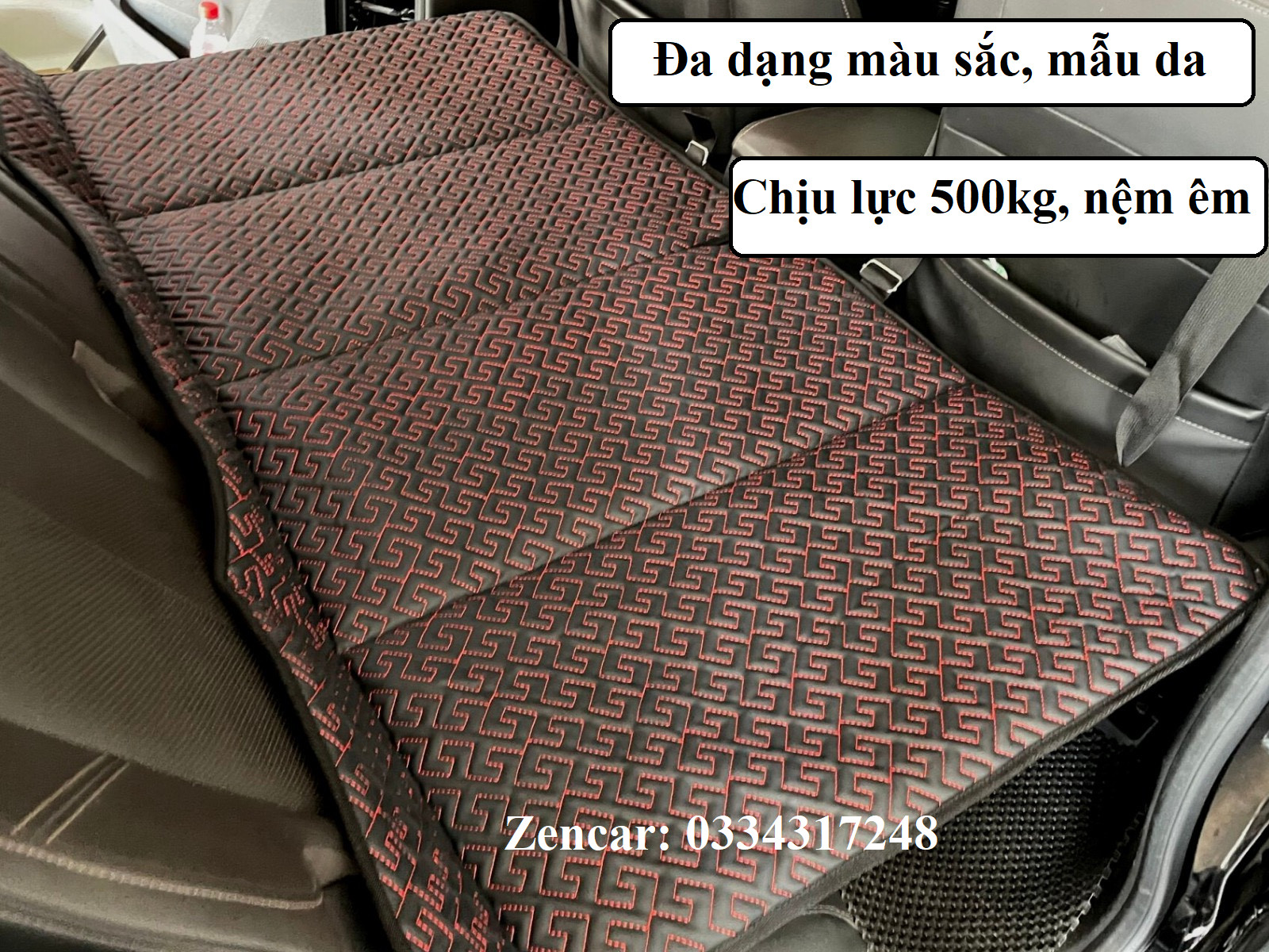 - Lót Gỗ MDF, Chịu lực lên đến 500kg - Bảo hành 2 năm, nhận GIA CÔNG RIÊNG theo yêu cầu khách. CÁCH LẮP ĐẶT: - Trải nệm lên hàng ghế sau - treo 2 dây đai lên 2 ghế phía trước, thắt khóa điều chỉnh độ dài dây đai phù hợp với xe. Nệm là mặt phẳng được cố định chắc chắn, chịu lực 500kg. - Gấp gọn làm 4 khi không sử dụng.