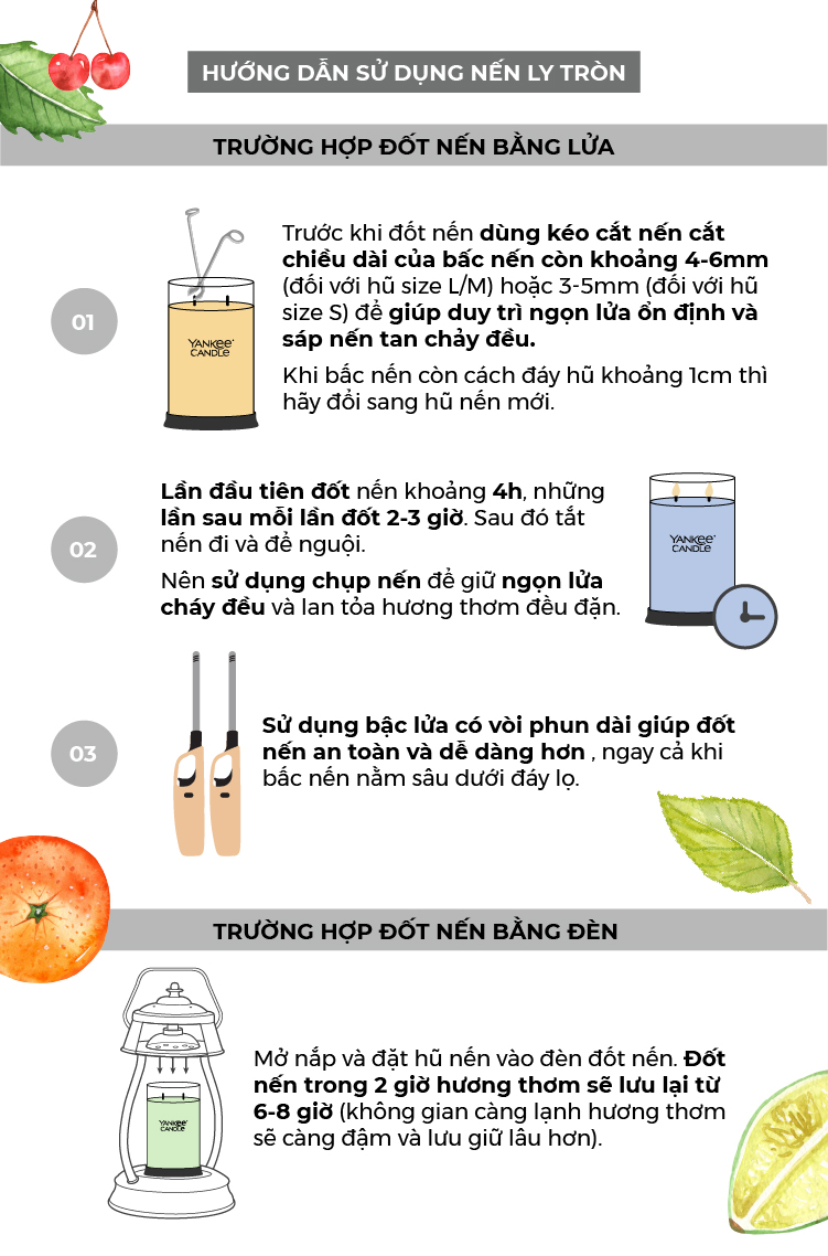 Kích thước (D x R x C cm): 8 x 8 x 10.5 Thời gian cháy: 35 giờ Được làm bằng sáp cao cấp và an toàn Ánh sáng dịu nhẹ, lãng mạn, hương thơm