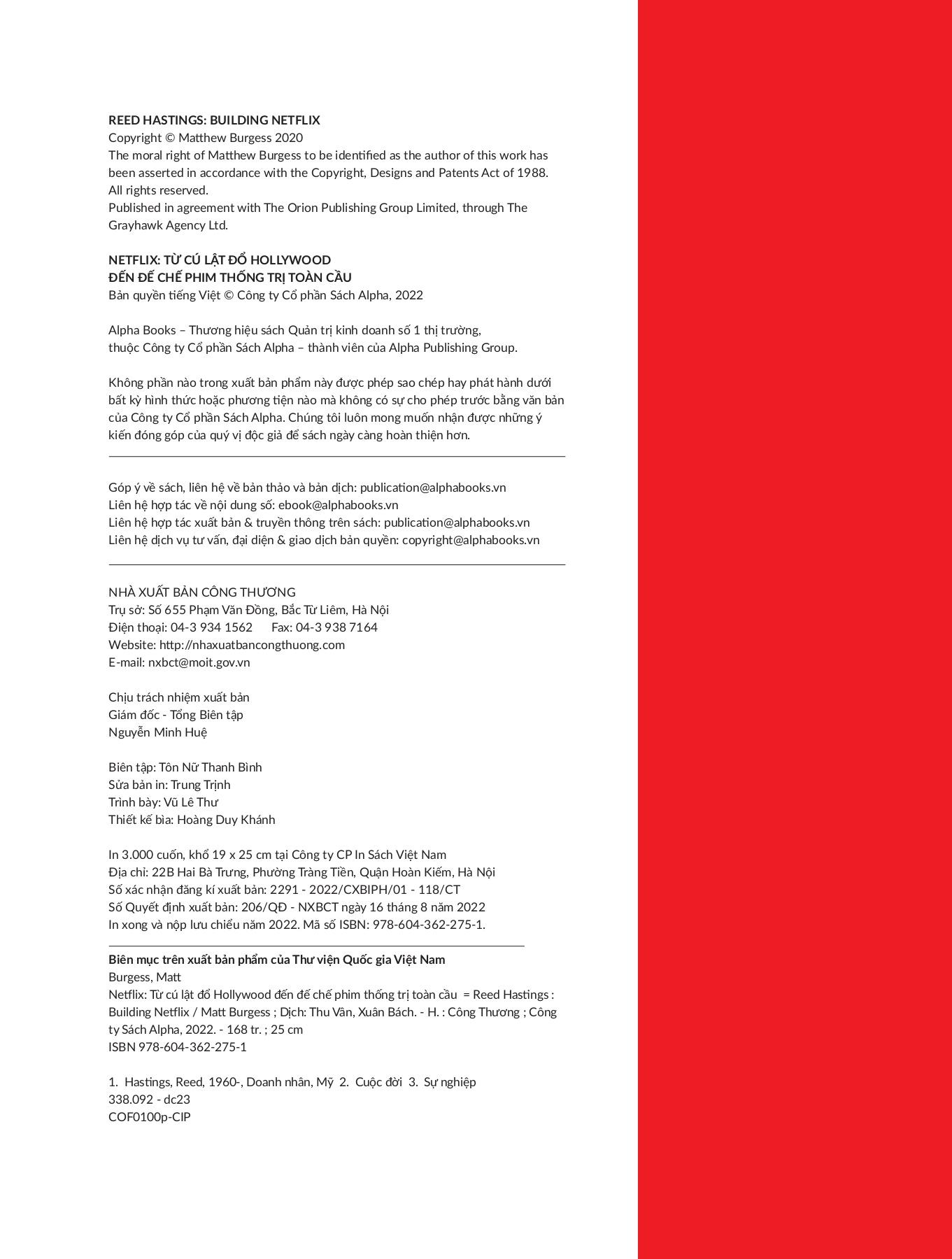 Cuốn sách trình bày tiểu sử ngắn gọn nhưng chi tiết cung cấp một cái nhìn tổng thể về quỹ đạo sự nghiệp của Hastings. Từ phong cách quản lý độc đáo của ông đến những sai lầm lớn nhất mà đã mắc phải trong suốt chặng đường xây dựng Netflix, rồi đến những lý do đằng sau quyết định đưa Netflix từ một công ty kinh doanh sản phẩm (DVD cho thuê) thành một công ty công nghệ tập trung vào phát trực tuyến, Burgess làm sáng tỏ Hastings “thành công và hướng tới những gì tương lai có thể mang lại cho ông và các dự án kinh doanh của ông.
