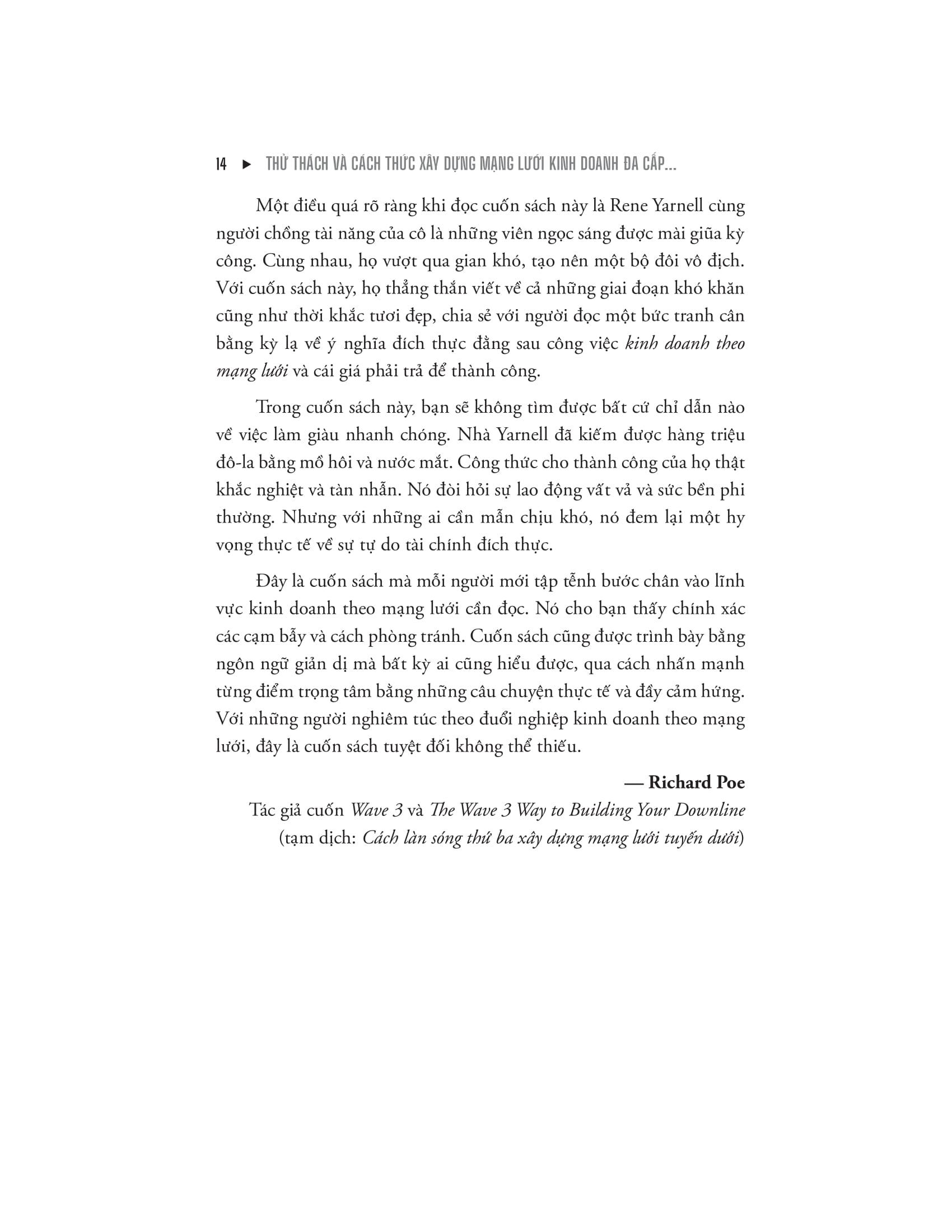 Với cả cuộc đời tham gia, đào tạo và huấn luyện tuyến dưới trong ngành kinh doanh mạng lưới rồi đạt được thành công vang dội trong ngành này tại nước Mỹ, Mark Yarnell và Rene Reid Yarnell sẽ giúp bạn tránh khỏi những cạm bẫy và sai lầm, đồng thời chỉ ra con đường đúng đắn giúp bạn đạt được tự do tài chính và tận hưởng khoảng thời gian tự do để ở bên những thân yêu, hay làm bất kỳ điều gì bạn mơ ước.