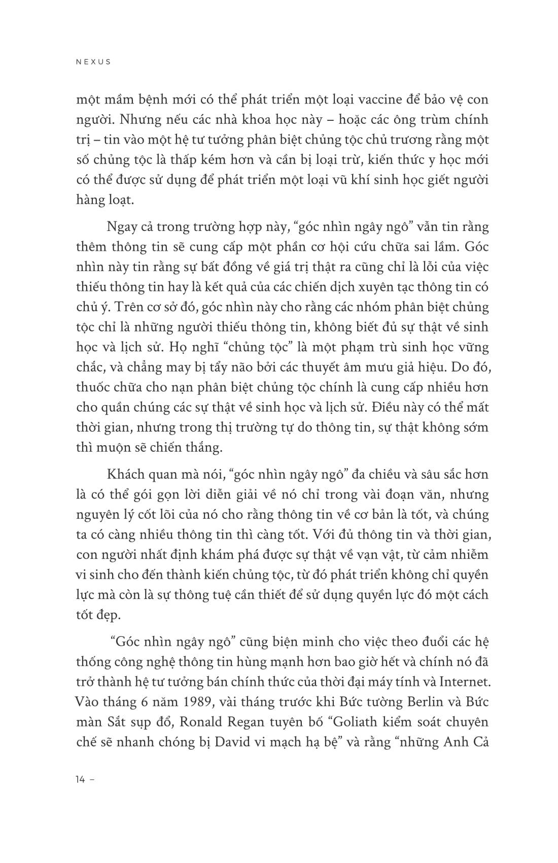 “Tầm quan trọng của những câu chuyện tiết lộ điều cơ bản về sức mạnh của loài người chúng ta, và nó cũng lý giải vì sao sức mạnh không phải lúc nào cũng đi đôi với sự khôn ngoan. Góc nhìn ngây ngô về thông tin nói rằng thông tin dẫn đến sự thật, và biết sự thật giúp mọi người đạt được cả quyền năng lẫn sự thông tuệ. Nghe có vẻ thật vững vàng. Nó ngụ ý rằng những kẻ phớt lờ sự thật sẽ khó mà đạt uy quyền, trong khi những người tôn trọng sự thật luôn có thể, và uy quyền của những người tôn trọng sự thật thì lại đã được trui rèn nhờ sự thông tuệ. Niềm tin này giả dụ rằng những kẻ khinh thị sự thật về sinh học của con người có thể là những kẻ phân biệt c.hủng tộc nhưng lại không đủ khả năng sản xuất các loại thuốc có tầm ảnh hưởng hay chế tạo các loại v.ũ khí sinh học tàn ác, trong khi những người hiểu biết về sinh học sẽ có năng lực sản xuất các sản phẩm nói trên nhưng họ lại không sử dụng chúng để phục vụ các hệ tư tưởng phân biệt c.hủng tộc. Nếu đó là sự thật, chúng ta có thể ngủ một giấc thật sâu, tin rằng các vị tổng thống, giáo chủ, và CEO sẽ luôn minh triết, chân thành. Một chính trị gia, một phong trào, hoặc một đất nước có thể vượt trội ở đâu đó với sự giúp đỡ của những lời nói dối và sự lọc lừa, nhưng về lâu dài nó cũng chỉ là một chiến lược khéo quá hóa vụng mà thôi.”
