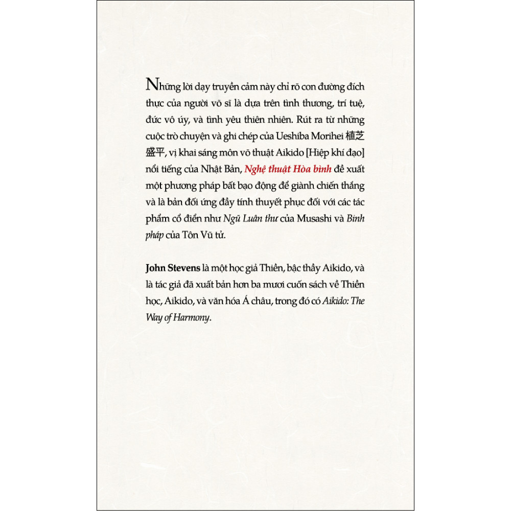 Từ những lời dạy hướng con người vào bên trong, chỉ rõ con đường chân chính của người võ sĩ là dựa trên tình thương, trí tuệ, đức vô uý, và tình yêu thiên nhiên, Nghệ thuật Hoà Bình chính là cuốn sách gối đầu giường không thể thiếu của mọi môn sinh Aikido.