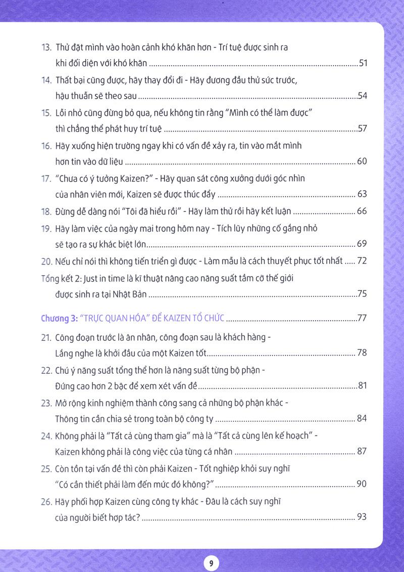 Kaizen của Toyota vốn là hệ thống được sinh ra tại nơi sản xuất nhưng đồng thời Kaizen cũng được xem là hệ thống đào tạo những con người biết suy nghĩ thông qua tạo ra những cơ hội để họ đưa ra trí tuệ. Cuốn sách này sử dụng nhiều ví dụ trong công xưởng sản xuất Toyota, nhưng nếu suy nghĩ ở khía cạnh “phương pháp tư duy” thì cuốn sách này có nhiều kinh nghiệm mà bất kỳ ai, bất kể lĩnh vực nào, thậm chí học sinh tiểu học cũng có thể áp dụng để tạo ra thành quả.