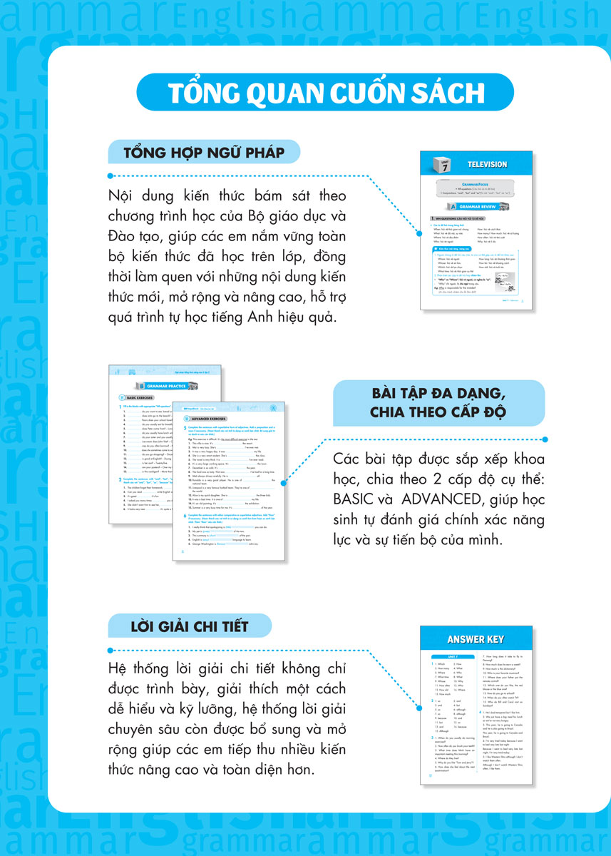 - Tổng hợp đầy đủ, rõ ràng kiến thức ngữ pháp bám sát theo chương trình học - Nội dung kiến thức bám sát theo chương trình học của Bộ giáo dục và Đào tạo, giúp các em nắm vững toàn bộ kiến thức đã học trên lớp, đồng thời làm quen với những nội dung kiến thức mới, mửo rộng và nâng cao, hỗ trợ quá trình tự học tiếng anh hiệu quả.