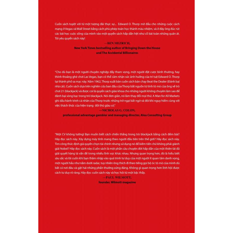 Trong cuốn “Người Đàn Ông Đánh Bại Mọi Thị Trường” (tựa gốc A man for all markets: from Las Vegas to Wall street), lần đầu tiên, quý vị độc giả được nghe Edward Thorp kể về hành trình đi đến đỉnh cao của sự thành công trong sự nghiệp đầu tư của mình. Hành trình được bắt đầu từ những đam mê thời niên thiếu kết hợp với sự tò mò sâu sắc đã dẫn ông tới các công trình nghiên cứu cụ thể, những luận điểm phản biện lại các lý thuyết và các ngộ nhận thông thường trong học thuật. Cuối cùng sao cho hiệu quả là việc ứng dụng những kiến thức này vào thực tiến chơi bài và đầu tư chứng khoán.