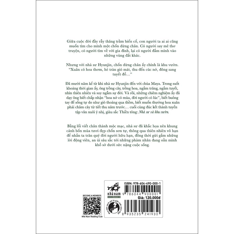 Đã mười năm kể từ khi nhà sư Hyunjin đến với chùa Maya. Trong suốt khoảng thười gian ấy, ông trồng cây, trồng hoa, ngắm trăng, ngăm tuyết, nhìn thiên nhiên và suy ngẫm sự đời. Và rồi, những chiêm nghiệm ấy đã dạy ông biết chấp nhận “hoa nở có mùa, đời người có lúc”, biết buông tay để sống tự do như gió thoảng qua thềm, biết muốn thưởng hoa xuân phải chăm cây từ tiết thu năm trước… cuối cùng đúc kết thành tuyển tập văn xuôi ý nhị, giàu sắc Thiền tông: Nhà sư và khu vườn.