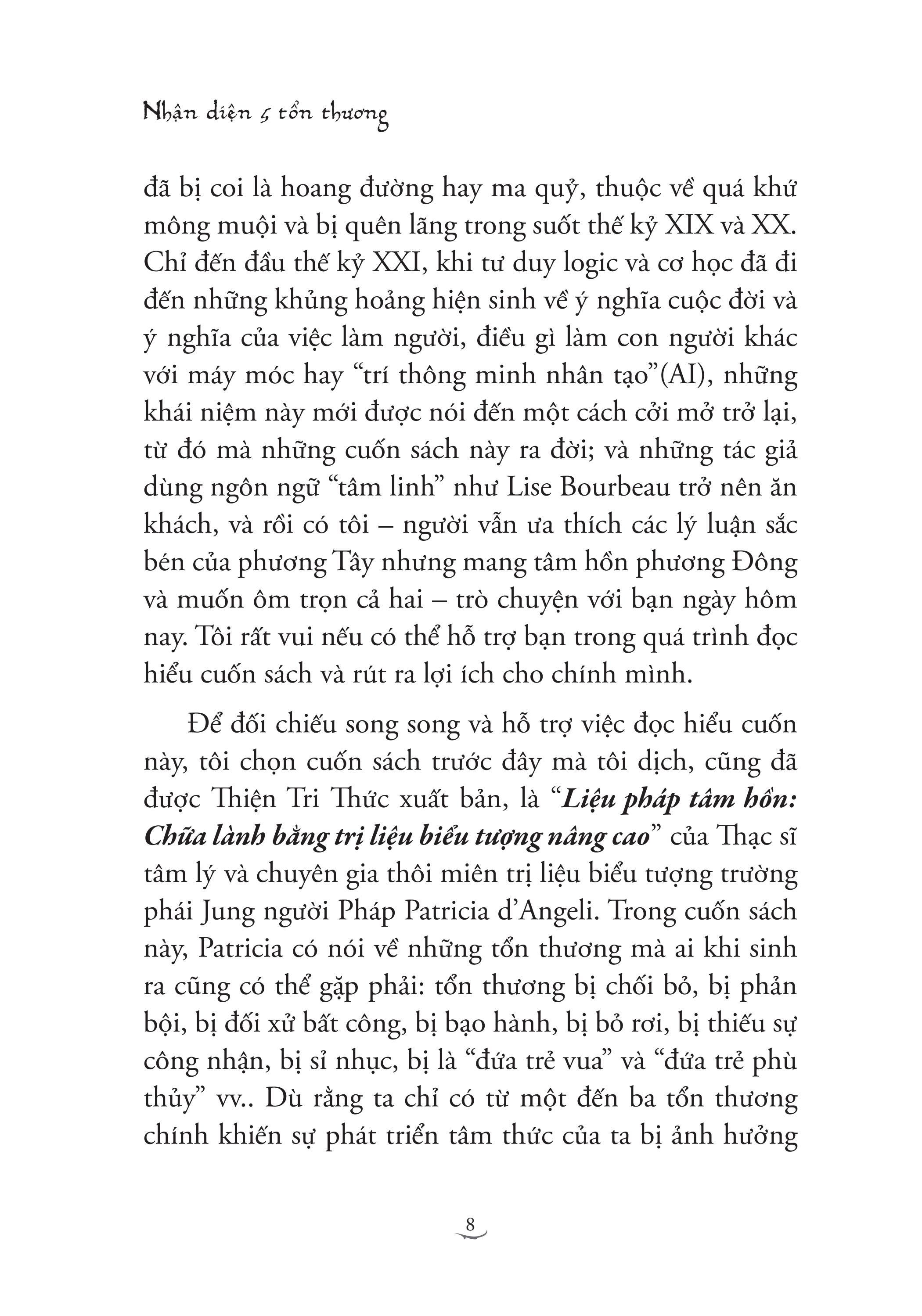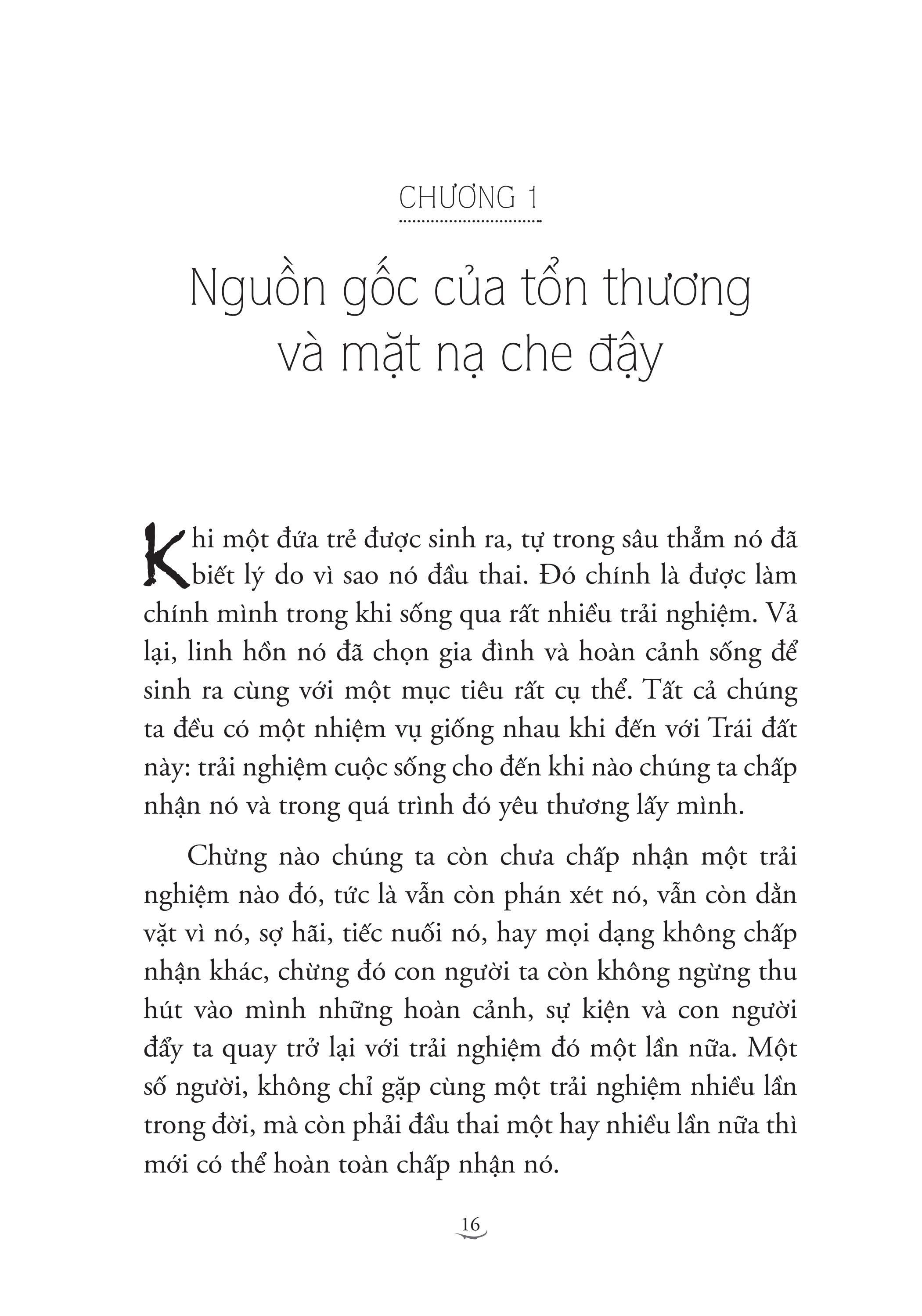 Nhận Diện 5 Tổn Thương GIỚI THIỆU SÁCH: Cuốn sách mô tả những quan sát của tác giả trong hình thể, ngôn ngữ và lời nói của những người đang tái diễn tổn thương (với tổn thương nhục nhã, bị bỏ rơi, bị phủ nhận, bị phản bội, bị đối xử bất công). Nhờ những miêu tả trực giác này của tác giả mà chúng ta có thể phán đoán được một người đang bị ảnh hưởng nhiều bởi chấn thương cảm xúc nào, và việc tự đánh đồng chấn thương cảm xúc đầu đời ấy đã tác động lên cuộc đời họ, cách họ sinh hoạt, nói năng, cách họ đưa ra các lựa chọn của đời m.ình, và rồi được biểu hiện qua cơ thể ra sao. Qua những tổn thương đó, chúng ta thấy được mối quan hệ giữa mặt nạ vô thức ta mang trong quá trình đối phó với những tổn thương và biểu hiện của chúng trên cơ thể ta. Thông qua cuốn sách, chúng ta dần thấu hiểu tâm thức của con người và có thể rút ra được bài học cho chính m.ình trên hành trình “thành nhân” (theo cách nói của Carl Rogers) hay “thành toàn tự ngã” (theo cách nói của Carl Jung) của mỗi chúng ta. TÁC GIẢ: Lise Bourbeau là tác giả nổi tiếng toàn cầu, bà đã viết 20 cuốn sách, trong đó có nhiều đầu sách best-seller về chủ đề lắng nghe cơ thể và nhận diện những tổn thương bên trong. Sách của bà được dịch ra gần 20 ngôn ngữ trên thế giới. Từ khi thành lập trường phái nghiên cứu của m.ình vào năm 1982, những tư tưởng của bà đã giúp đỡ rất nhiều người cải thiện chất lượng cuộc sống và tạo ra những thay đổi bền vững hàng ngày. Lắng nghe cơ thể bạn, trường phái phát triển bản thân có sức ảnh hưởng lớn nhất ở Quebec, đã được truyền bá trong các buổi hội thảo trên hơn 20 quốc gia và trong 10 thứ ngôn ngữ. Bộ sách “Nhận diện 5 tổn thương” và “Chữa lành 5 tổn thương” là hai trong số rất nhiều đầu sách best-seller của bà. TRÍCH ĐOẠN SÁCH HAY: Khi một đứa trẻ được sinh ra, tự trong sâu thẳm nó đã biết lý do vì sao nó đầu thai. Đó chính là được làm chính m.ình trong khi sống qua rất nhiều trải nghiệm. Vả lại, linh hồn nó đã chọn gia đình và hoàn cảnh sống để sinh ra cùng với một mục tiêu rất cụ thể. Tất cả chúng ta đều có một nhiệm vụ giống nhau khi đến với Trái đất này: trải nghiệm cuộc sống cho đến khi nào chúng ta chấp nhận nó và trong quá trình đó yêu thương lấy m.ình. Chừng nào chúng ta còn chưa chấp nhận một trải nghiệm nào đó, tức là vẫn còn phán xét nó, vẫn còn dằn vặt vì nó, sợ hãi, tiếc nuối nó, hay mọi dạng không chấp nhận khác, chừng đó con người ta còn không ngừng thu hút vào m.ình những hoàn cảnh, sự kiện và con người đẩy ta quay trở lại với trải nghiệm đó một lần nữa. Một số người, không chỉ gặp cùng một trải nghiệm nhiều lần trong đời, mà còn phải đầu thai một hay nhiều lần nữa thì mới có thể hoàn toàn chấp nhận nó. Chấp nhận một trải nghiệm nào đó không có nghĩa là chúng ta mong muốn có nó hay đồng tình với nó, mà đúng hơn là cho phép ta cảm thụ và học hỏi từ những gì ta đã trải qua. Đặc biệt chúng ta phải học cách nhận ra cái gì là có ích cho m.ình, cái gì là không. Cách duy nhất để nhận ra điều đó là trở nên ý thức về hậu quả của mỗi trải nghiệm. Tất cả những gì mà ta đã lựa chọn hoặc không lựa chọn, tất cả những gì mà ta đã làm hoặc không làm, tất cả những gì mà ta đã nói hoặc không nói và thậm chí tất cả những gì ta đã nghĩ và không nghĩ, đã cảm và không cảm đều để lại hậu quả. Trước khi đi vào miêu tả các giai đoạn chữa lành cho mỗi loại tổn thương và mặt nạ ngụy trang, tôi xin được chia sẻ với các bạn những quan sát liên quan tới cung cách đi đứng, nằm ngồi, nhảy mú của những người thuộc từng loại tổn thương. Điều này sẽ làm rõ sự khác nhau về hành vi của các mặt nạ. Tùy theo mặt nạ mà cách nói chuyện và giọng nói của người ta sẽ khác: