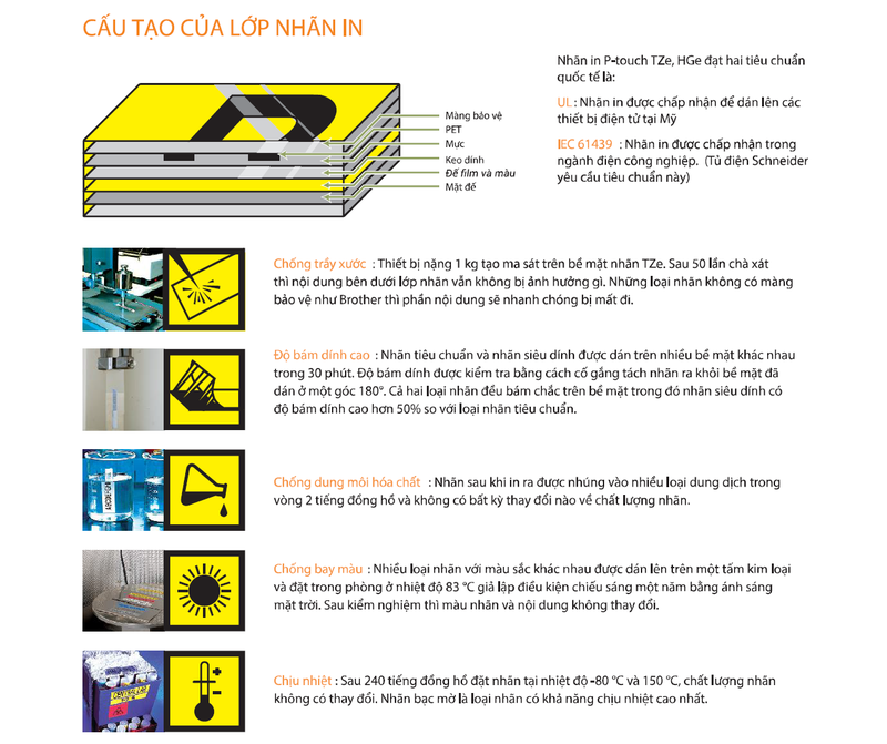Nhãn sau khi in ra được nhúng vào trong nhiều loại dung dịch trong vòng 2 tiếng đồng hồ và không có bất kì thay đổi nào về chất lượng nhãn. Nhãn In Tiêu Chuẩn TZE Brother được dán lên trên 1 tấm kim loại và đặt trong phòng ở nhiệt độ 83 độ C giả lập điều kiện chiếu sáng 1 năm bằng ánh sáng mặt trời. Sau kiểm nghiệm thì màu nhãn và nội dung không thay đổi.