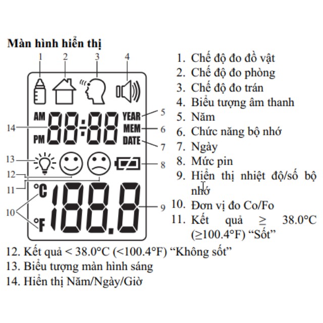 - Hiển thị trên màn hình kết quả cùng ngày, giờ đo nhiệt độ.