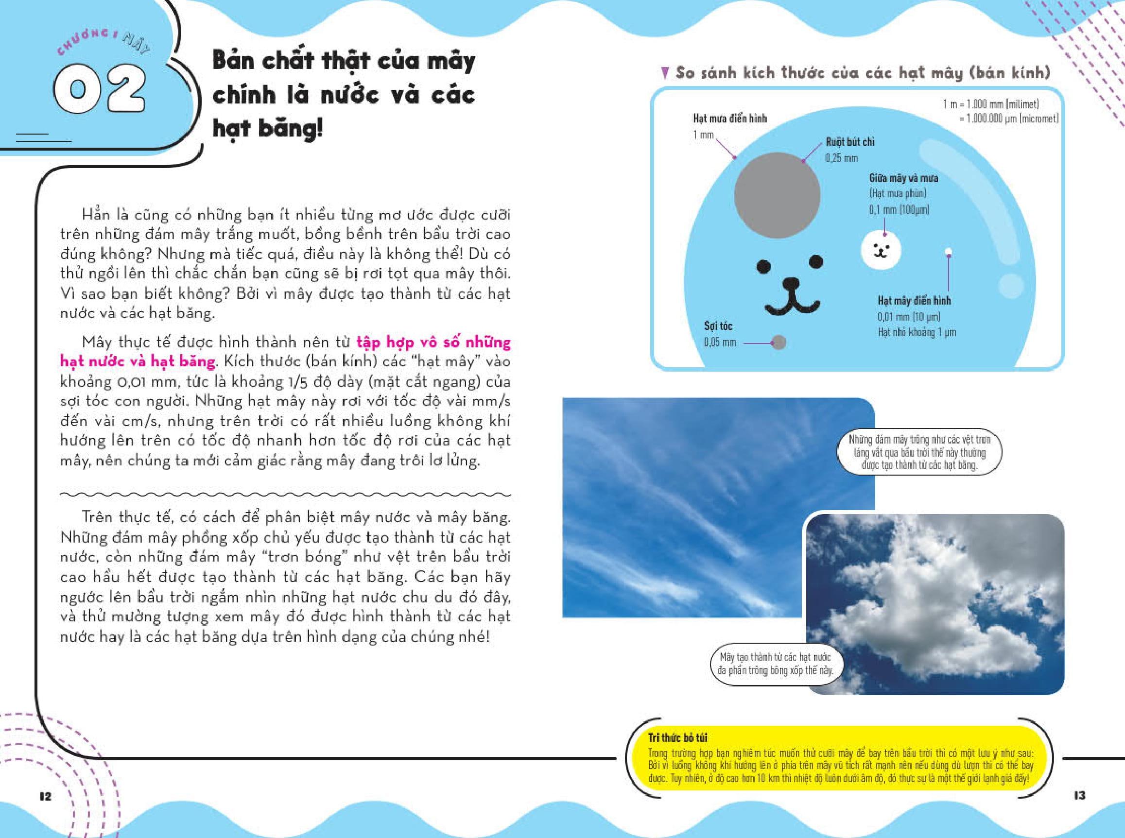 Mua tại TiktokNhững Kì Quan Thời Tiết - Từ Điển Bỏ Túi Về Các Hiện Tượng Thiên Nhiên Kì Thú - Tập 1 Mỗi khi ngước nhìn bầu trời, hẳn mỗi người trong chúng ta đều một lần nghĩ rằng: “Mình muốn leo lên những đám mây khổng lồ quá!”, hoặc “Không biết điểm cuối của cầu vồng ở đâu nhỉ?”. Bầu trời quá đỗi thân thuộc khi ngày ngày chúng ta vẫn ngắm nhìn nó và lắng nghe dự báo thời tiết trên tivi, thế nhưng vẫn còn rất nhiều điều về bầu trời mà chúng ta chẳng hay biết đến. Với cách diễn giải đơn giản, dễ hiểu cùng hình minh họa trực quan, sinh động, bộ sách Những Kì Quan Thời Tiết – Từ Điển Bỏ Túi Về Các Hiện Tượng Thiên Nhiên Kì Thú sẽ giải đáp nhiều thắc mắc của độc giả về bầu trời, các đám mây, các hiện tượng thời tiết vừa quen thuộc, vừa lạ kì. Bộ sách sẽ kéo gần khoảng cách giữa chúng ta với bầu trời và những đám mây, khiến bạn phải sửng sốt thốt lên: “A! Nguyên do của hiện tượng đó là thế!”