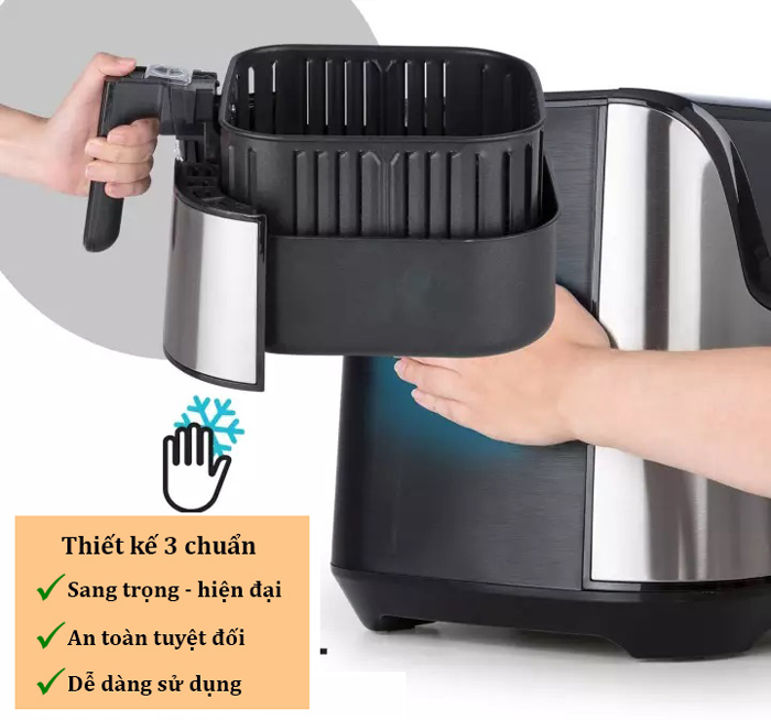 THÔNG SỐ KỸ THUẬT : - Dung tích rổ chiên 5.5L - Dung tích nồi chiên 7L - Bảng điều khiển Cảm ứng/ chạm - Ngôn ngữ Tiếng Việt - Điện áp 220-240V 50/60Hz - Công suất 1600W - Màu sắc Xám - Hiển thị Đèn Led trắng - Lớp phủ rổ bên trong/ ngoài Có - Lớp phủ nồi trong / ngoài Có - Thực đơn tự động 8 (Khoai tây chiên, Bít tết, Rau xanh, Gà, Bánh nướng, Cá, Đồ đông lạnh, Pizza) -