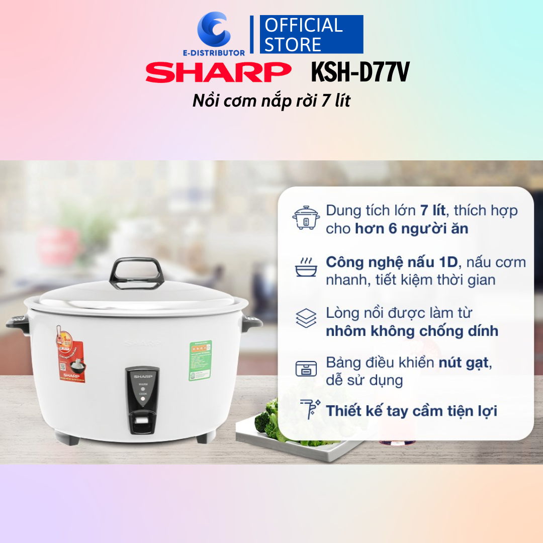 Nồi cơm nắp rời Sharp 7 lít KSH-D77V là giải pháp hiệu quả giúp nấu cơm số lượng nhiều và muốn cơm chín nhanh, phù hợp cho những gia đình đông người hay quán cơm, nhà hàng,...