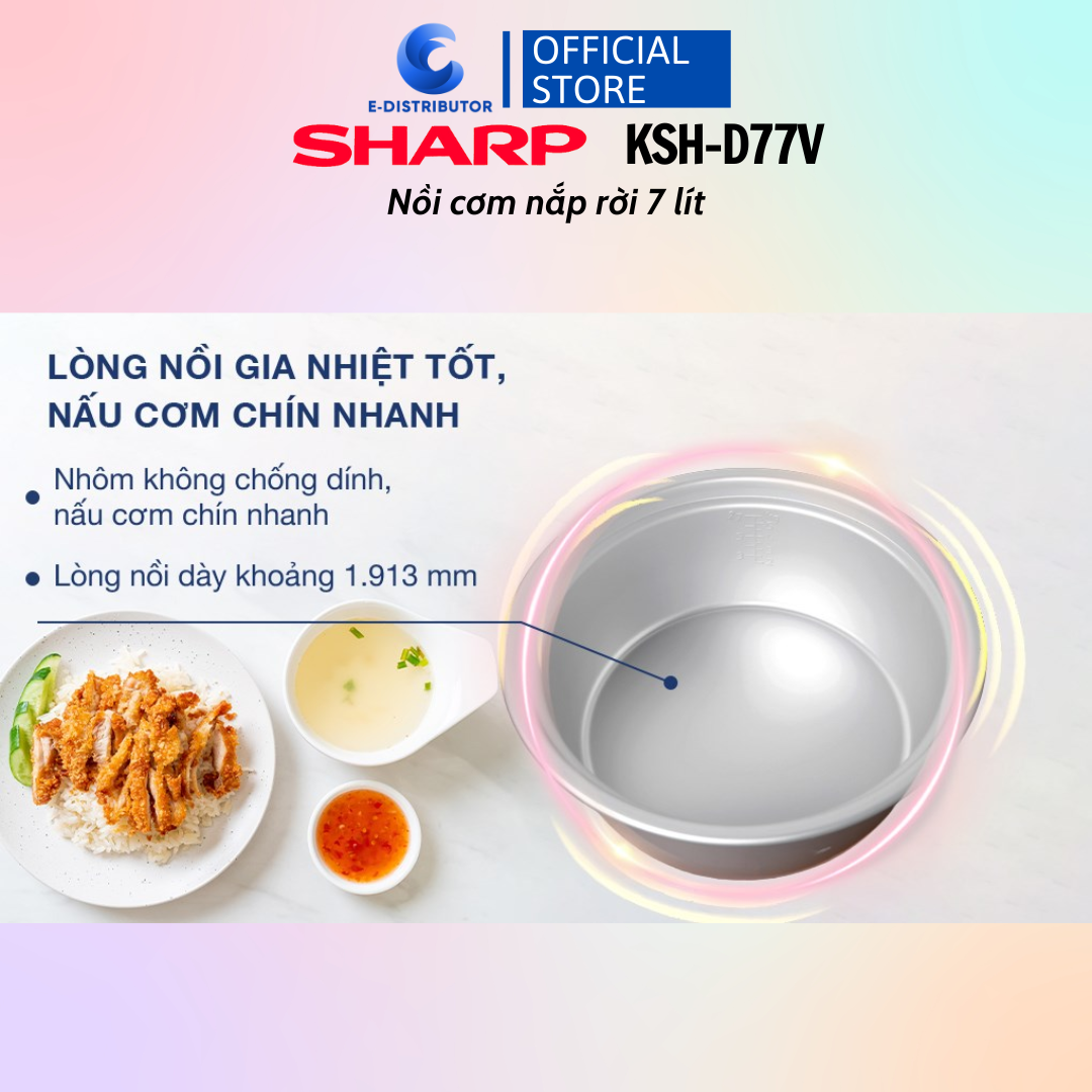 Nồi cơm nắp rời Sharp 7 lít KSH-D77V nhập khẩu từ Thái Lan, nấu cơm chín nhanh nhờ công nghệ nấu 1D, dung tích lớn 7 lít, nút gạt dễ thao tác,... hỗ trợ chế biến khẩu phần cơm cho gia đình đông người hay quán ăn.