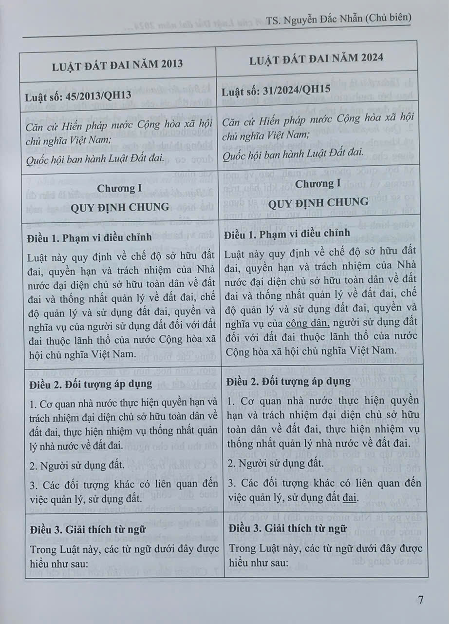 Luật Đất đai năm 2024 có 16 chương, tăng 02 chương so với Luật Đất đai năm 2013 do bổ sung chương Phát triển, quản lý và khai thác quỹ đất (Chương VIII), tách riêng chương Thu hồi đất, trưng dụng đất (Chương VI) và Bồi thường, hỗ trợ, tái định cư khi Nhà nước thu hồi đất (Chương VII); thứ tự sắp xếp các chương của Luật Đất đai năm 2024 không giữ nguyên như Luật Đất đai năm 2013 mà được sắp xếp, bố cục theo trình tự thực hiện các nhiệm vụ quản lý nhà nước về đất đai để tiện theo dõi, tra cứu và thuận lợi hơn trong triển khai thi hành Luật nên thứ tự các điều luật của Luật Đất đai năm 2024 và Luật Đất đai năm 2013 không song hành với nhau. Chính vì vậy, để tra cứu và thực thi Luật Đất đai năm 2024 được thuận lợi, cuốn sách này thiết kế 02 cột Luật (cột Luật Đất đai năm 2013 và cột Luật Đất đai năm 2024), trong đó, tại cột Luật Đất đai năm 2024 trình bày các điều luật theo thứ tự tự nhiên (từ Điều 1 đến Điều 260), còn cột Luật Đất đai năm 2013 (văn bản hợp nhất Luật Đất đai năm 2013) trình bày các điều luật có nội dung tương ứng với điều luật bên cột Luật Đất đai năm 2024 nên không theo thứ tự tự nhiên (từ Điều 1 đến Điều 212).
