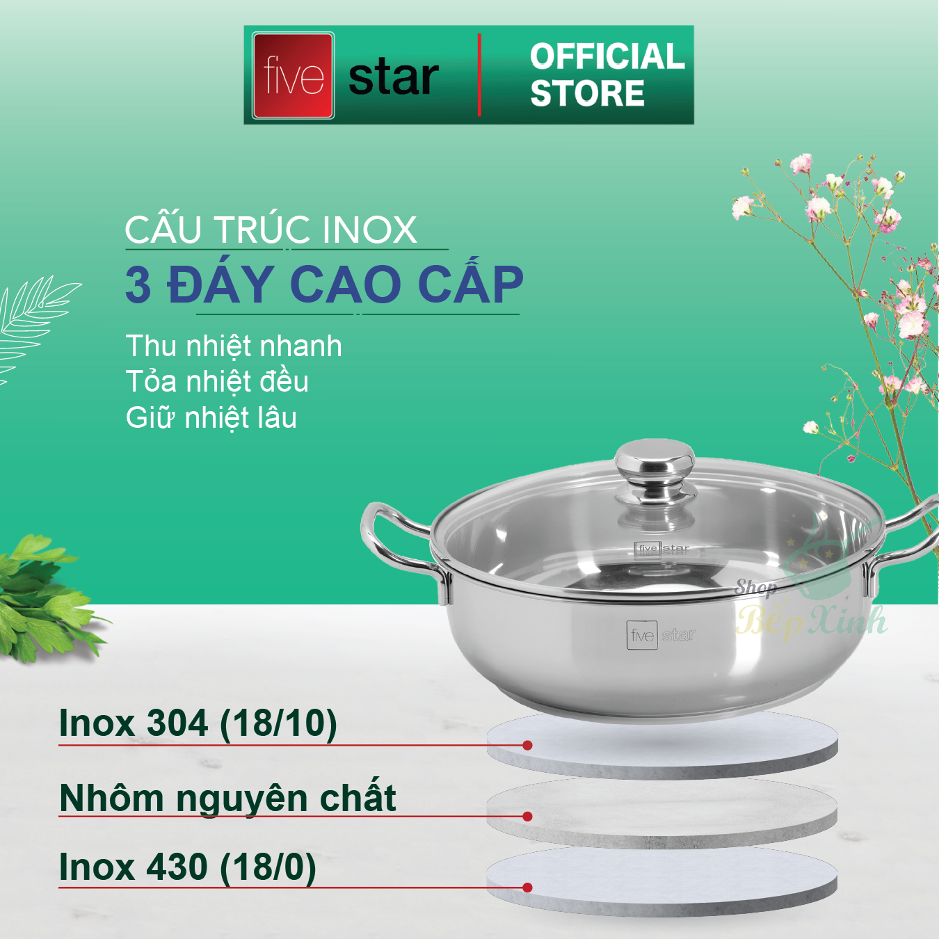 Nồi lẩu um xào inox 430 bếp từ 3 đáy Fivestar nắp kính ( 24cm / 26cm / 28cm ) NỒI LẨU INOX 32CM : – Thiết kế theo công nghệ hiện đại, kiểu dáng
