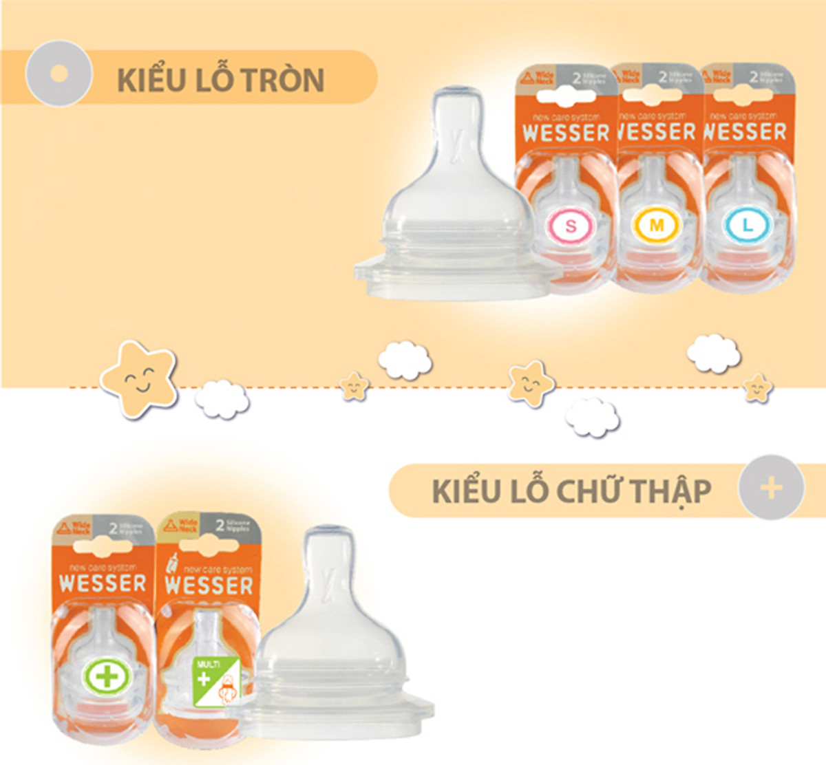 silicone Wesser cổ rộng siêu mềm với thiết kế độc đáo giúp núm vú có độ đàn hồi vượt trội, siêu mềm mại, bầu rộng giống vú mẹ, giúp trẻ dễ dàng thích nghi khi chuyển