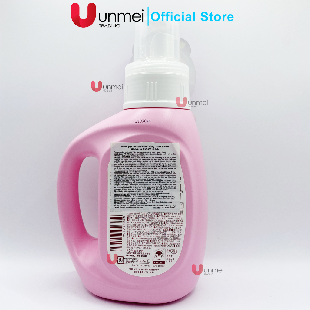 - Nước Giặt Arau Baby Dạng Bình 800ml chứa 100% thảo mộc tự nhiên gồm tinh dầu oải hương và bạc hà. - Không có chất phụ gia, chất tạo màu, tạo mùi và chất