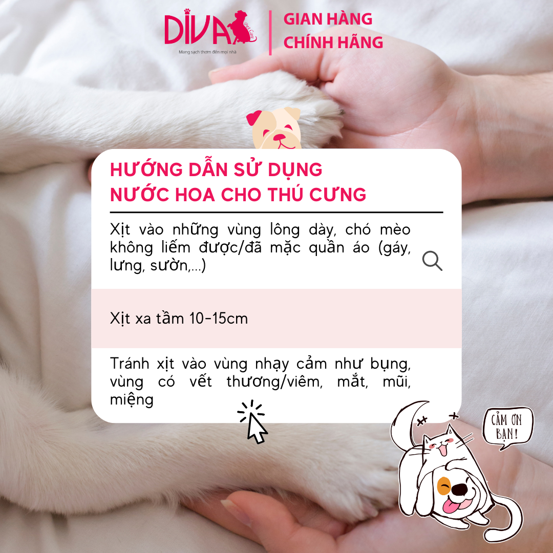 Mua tại TiktokDiva tự hào là thương hiệu đầu tiên tại Việt Nam sản xuất dòng nước hoa cao cấp dành cho thú cưng. Nước hoa Diva không chứa paraben, hoàn toàn an toàn cho thú cưng và người nuôi, với khả năng lưu hương từ 2-4 ngày. Hiện tại, nước hoa Diva đã cho ra mắt 2 mùi hương đầu tiên.
