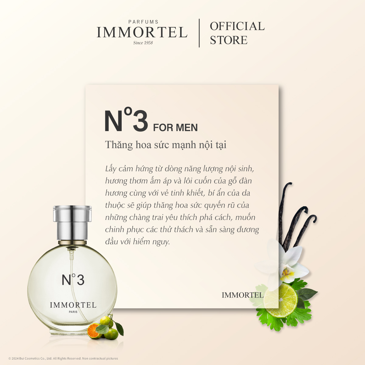 IMMORTEL PARIS ️ Nước hoa IMMORTEL được thành lập từ năm 1958 và là một trong những nhãn hiệu nước hoa nổi tiếng. Ngoài trụ sở chính ở Pháp, IMMORTEL đã có mặt tại Việt Nam và được phân phối độc quyền bởi Bui Cosmetics Co., Ltd. từ 2004 ️ Các sản phẩm nước hoa của IMMORTEL được chọn lọc kĩ lưỡng từ những dòng nước hoa chất lượng trong phòng thí nghiệm của IMMORTEL Paris và được nhập khẩu chính hãng từ Pháp, quê hương của nước hoa    Giới thiệu về Nước Hoa IMMORTEL PARIS N°3:   FOR MEN - Thăng hoa sức mạnh nội tại: Lấy cảm hứng từ dòng năng lượng nội sinh, mùi hương mới IMMORTEL phát minh ra được đặt tên thánh là “N°3” Hương thơm ấm áp và lôi cuốn của gỗ đàn hương cùng với vẻ tinh khiết, bí ẩn của da thuộc này sẽ quyến rũ những chàng trai yêu thích sự phá cách, muốn chinh phục các thử thách và sẵn sàng đương đầu với hiểm nguy.  Nước hoa IMMORTEL N°3 là một bản giao hưởng với 3 tầng hương: - Hương đầu: Cây bạc hà, Hạt tiêu hồng, Quả chanh, Lá dứa, Bạch đậu khấu, Quả quất, Quả quýt, Quả cam - Hương giữa: Lan Nam Phi, Nhục đậu khấu, Rau mùi, Cây bách xù, Cây xô thơm, Hoa nhài - Hương cuối: Gỗ tếch, Da thuộc, Hương Vani  Hướng dẫn sử dụng: - Lắc đều, giữ chai cách cơ thể khoảng 15 - 20cm, xịt ở những vùng da tập trung nhiều mạch (cổ tay, sau gáy, ngực) - Không xịt trực tiếp lên quần áo, đồ trang sức - Bảo quản: nơi khô ráo, thoáng mát, tránh ánh nắng trực tiếp và nhiệt độ cao CAM KẾT: + Sản phẩm do IMMORTEL phân phối là hàng chính hãng 100% + Sản phẩm được sản xuất và đóng gói một cách kỹ lưỡng. Chất lượng đồng đều cho tất cả dung tích + IMMORTEL hoạt động với tiêu chí đặt lợi ích của khách hàng lên hàng đầu, nghiêm túc, trung thực, tận tâm + Hoạt động đa nền tảng, đồng bộ hóa thương hiệu để khách hàng có thể tìm kiếm và liên lạc một cách tiện lợi nhất