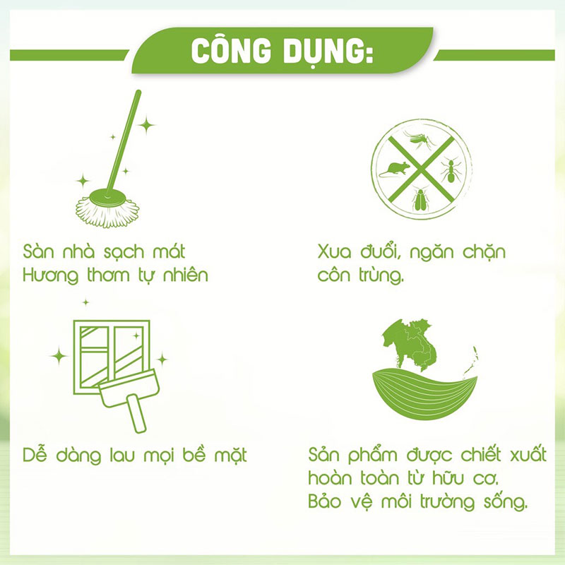 1. Không chỉ giúp lau nhà sạch hiệu quả, mà còn giúp thanh lọc không gian sống với hương thơm thiên nhiên 2. Chứa tinh dầu thảo mộc, đem lại hương thơm thư thái, dễ