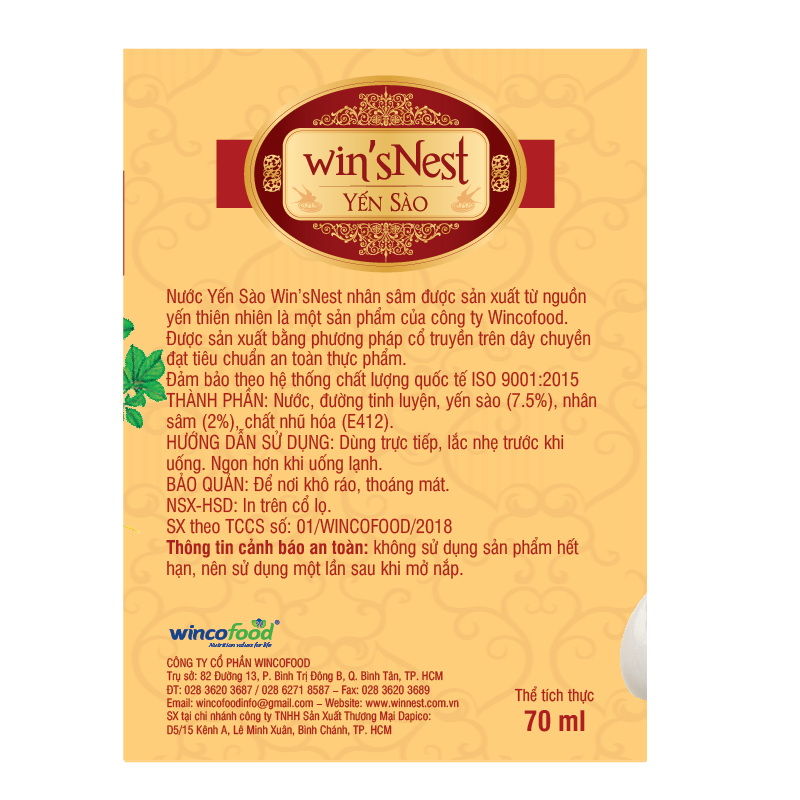 Mua tại TiktokNước Yến sào cao cấp win'sNest Nhân Sâm chưng sẵn đường phèn được sản xuất từ nguồn yến đảo thiên nhiên, là một sản phẩm của công ty wincofood. Được sản xuất bằng phương pháp cổ truyền trên dây chuyền đạt tiểu chuẩn an toàn thực phẩm. Đảm bảo theo tiêu chuẩn hệ thống chất lượng quốc tế ISO 9001:2015 và HACCP Chỉ tiêu chất lượng: Protein, canxi, năng lượng, hàm lượng chất khô.