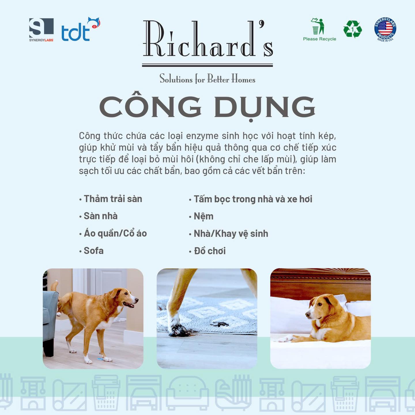 Richard’s Stain & Odor Eliminator có công thức chứa các loại enzyme sinh học với hoạt tính kép, giúp khử mùi và tẩy bẩn hiệu quả thông qua cơ chế tiếp xúc trực tiếp để loại bỏ mùi hôi (không chỉ che lấp mùi), giúp làm sạch tối ưu các chất bẩn, bao gồm cả các vết bẩn trên thảm trải sàn, màu vẽ…