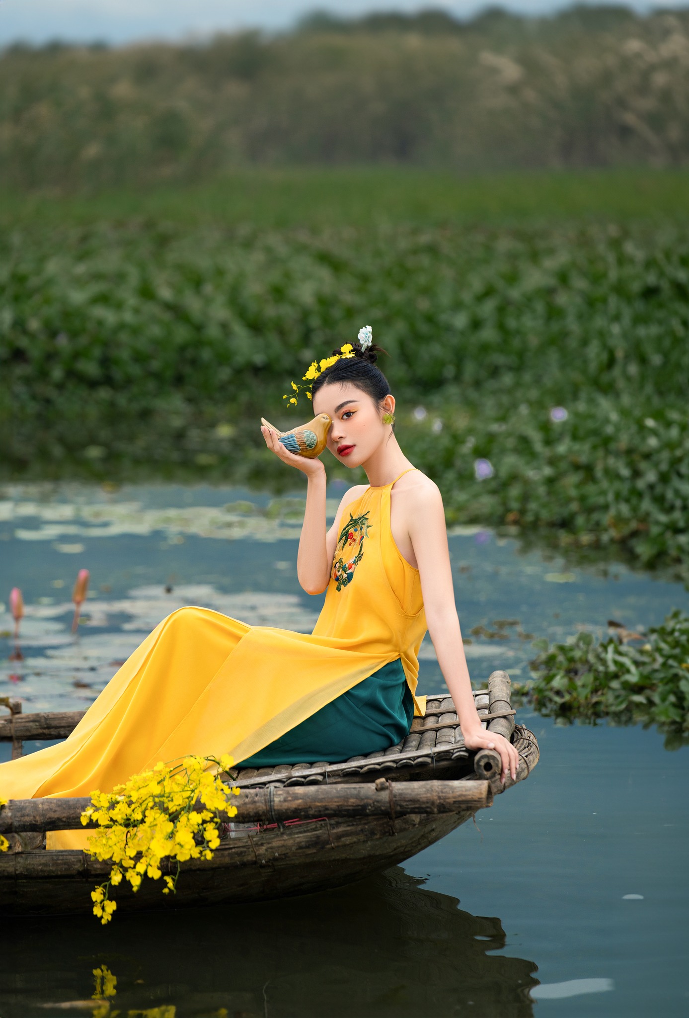 áo dài suông vàng được may bằng chất liệu lụa gấm loại 1 kết hoa và cườm, tay lỡ loe, quần lụa trắng