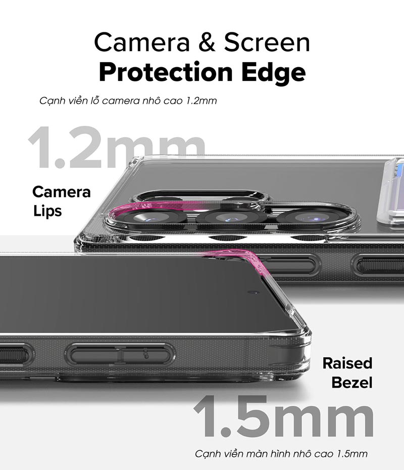 Thiết kế cạnh gờ mặt lưng (vị trí camera) nhô cao 0.75mm và thiết kế cạnh viền màn hình nhô cao 1.5mm giúp chống trầy.
