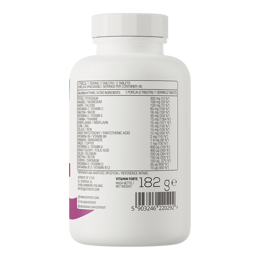 Thành phần trong mỗi viên Ostrovit Vit&Min Forte được lựa chọn theo cách mà các Vitamin và khoáng chất có trong nó sẽ tác động một cách tích cực nhất lên các quá trình sinh hóa xảy ra trong cơ thể. Đó là những loại mà khi bổ sung và cung cấp đầy đủ sẽ rất cần thiết để duy trì thể chất và trạng thái tinh thần đỉnh cao, sức khỏe hoàn hảo và sự cân bằng ổn định cho cơ thể.