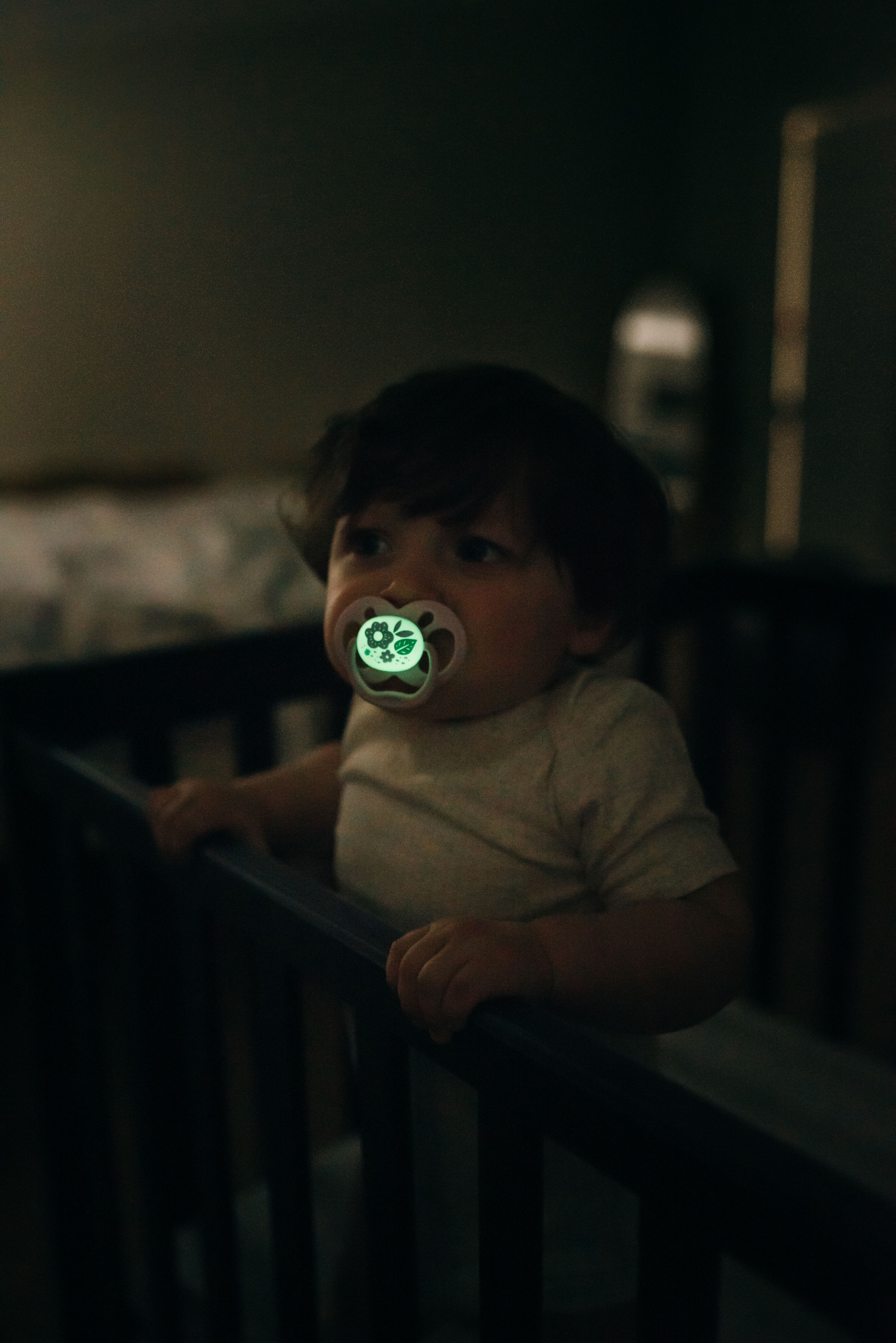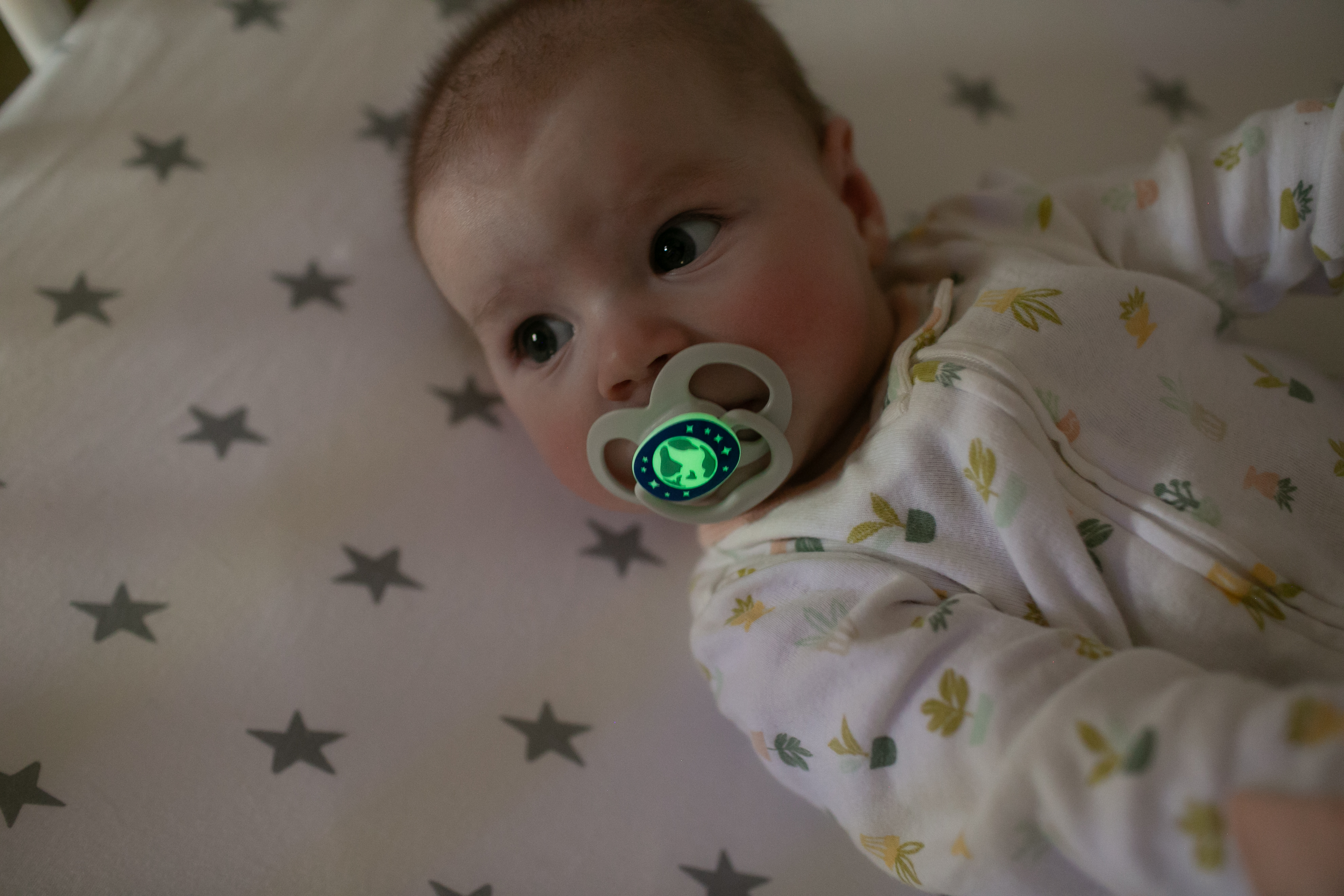 - Ty ngậm sẽ phát sáng trong bóng tối giúp mẹ dễ dàng tìm thấy khi cần