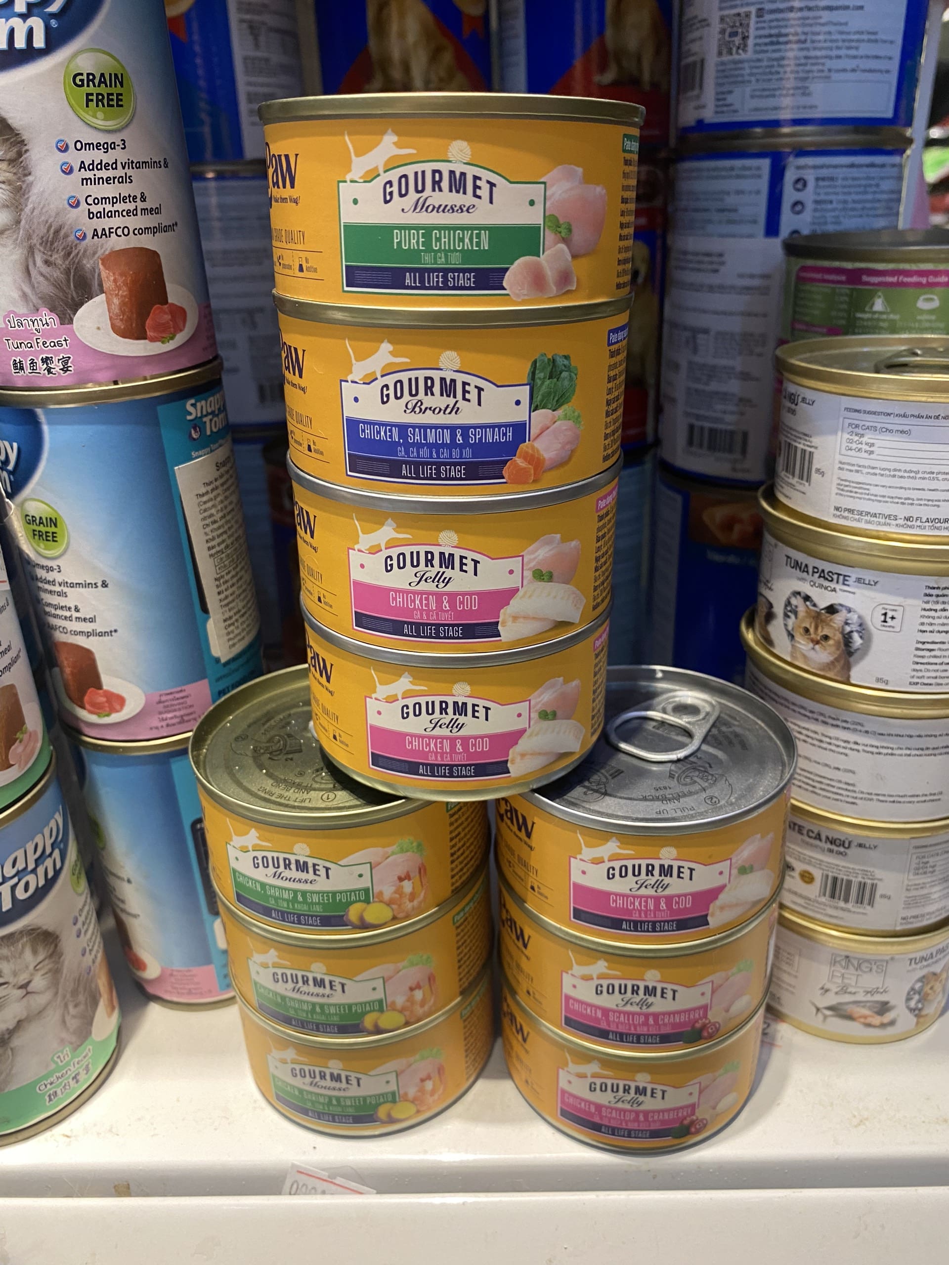 Pate LaPaw Cho Mèo Mọi Lứa Tuổi 85g Sản phẩm có 11 vị: - Dạng súp (Broth) + Gà bí đỏ broth + Gà, cá hồi, bó xôi broth + Cá ngừ broth - Dạng kem (Cream): + Gà cream + Cá ngừ cream - Dạng thạch (Jelly): + Gà & sụn gà jelly + Gà, cá tuyết jelly + Gà, sò điệp, nam việt quất (cranberry) jelly - Dạng nhuyễn (Mousse): + Gà, tôm, khoai lang mousse + Gà mousse ️THÀNH PHẦN DINH DƯỠNG Pate LaPaw dạng kem sữa: - Ức gà, bột sữa dê, nước tinh khiết, gaurgun, hydroxypropyl distarch phosphate, taurine, vitamins tổng hợp (A,D3,E), khoáng chất. Pate LaPaw dạng nhuyễn: - Gà, tôm, khoai lang: Ức gà, tôm, khoai lang, thịt gà xay nhuyễn, lòng gà, gan gà, dầu gà, nước, bột năng, taurine, vitamin tổng hợp (A,D3,B1,B2,B6,V12), niacin…. - Gà tươi: Thịt gà, chân gà rút xương, tim gà, gan gà, dầu gà, nước, bột năng, taurine, vitamin tổng hợp (A,D3,B1,B2,B6,V12), niacin…. - Cá hồi và gà: Cá hồi, thịt gà xay, tim gà, gan gà, dầu cá, nước, bột năng, taurine, vitamin tổng hợp (A,D3,B1,B2,B6,V12), niacin…. Pate LaPaw dạng súp: - Vị Gà, Cá hồi, Bó xôi: Ức gà, cá hồi, cải bó xôi, nước tinh khiết, gourgun, taurine,vitamin tổng hợp (A,D3,B1,B2,B6,V12), khoáng chấ Pate LaPaw dạng thạch: - Vị gà, sò điệp và quả nam việt quất: Ức gà, sò điệp, bột nam việt quất, nước tinh khiết, guargun, taurine, ,vitamin tổng hợp (A,D3,B1,B2,B6,V12), khoáng chấ - Vị gà và sụn gà: Ức gà, sụn gà, nước tinh khiết, guargun,vitamin tổng hợp (A,D3,B1,B2,B6,V12), khoáng chấ ️ LỢI ÍCH: - Đảm bảo cung cấp đầy đủ lượng protein tự nhiên dễ hấp thụ và đầy đủ dinh dưỡng. - Tăng cường đề kháng - Cải thiện hệ tiêu hóa ️ HDSD: - Có thể ăn trực tiếp hoặc kết hợp cùng hạt dinh dưỡng laPaw Gourmet - Bảo quản nơi thoáng mát - Phù hợp cho mèo mọi lứa tuổi ( khuyên dùng trên 3 tháng tuổi) Quy cách: lon 85g