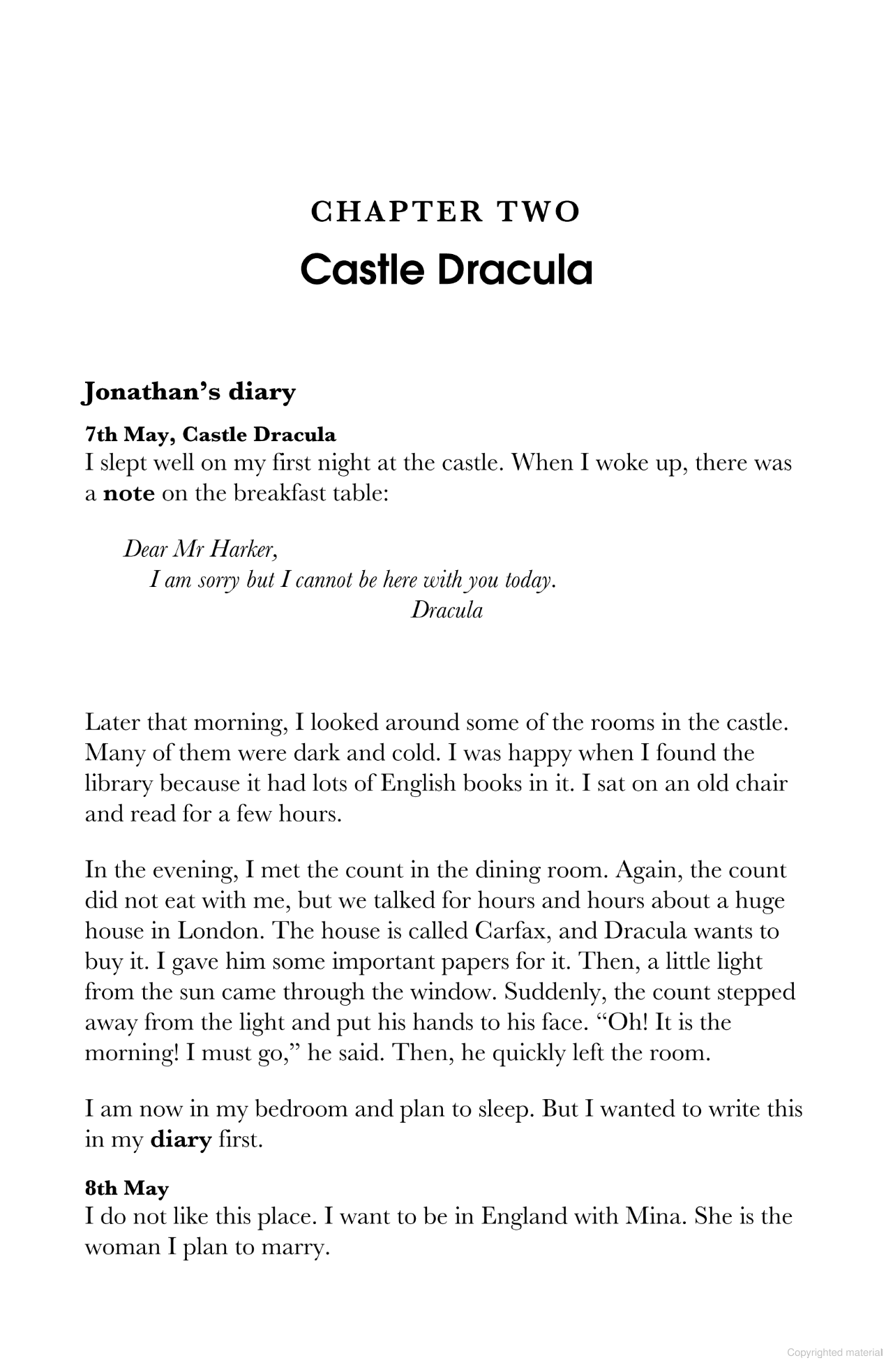 Dracula, a Level 3 Reader, is A2 in the CEFR framework. The text is made up of sentences with up to three clauses, introducing first conditional, past continuous and present perfect simple for general experience. It is well supported by illustrations, which appear on most pages.