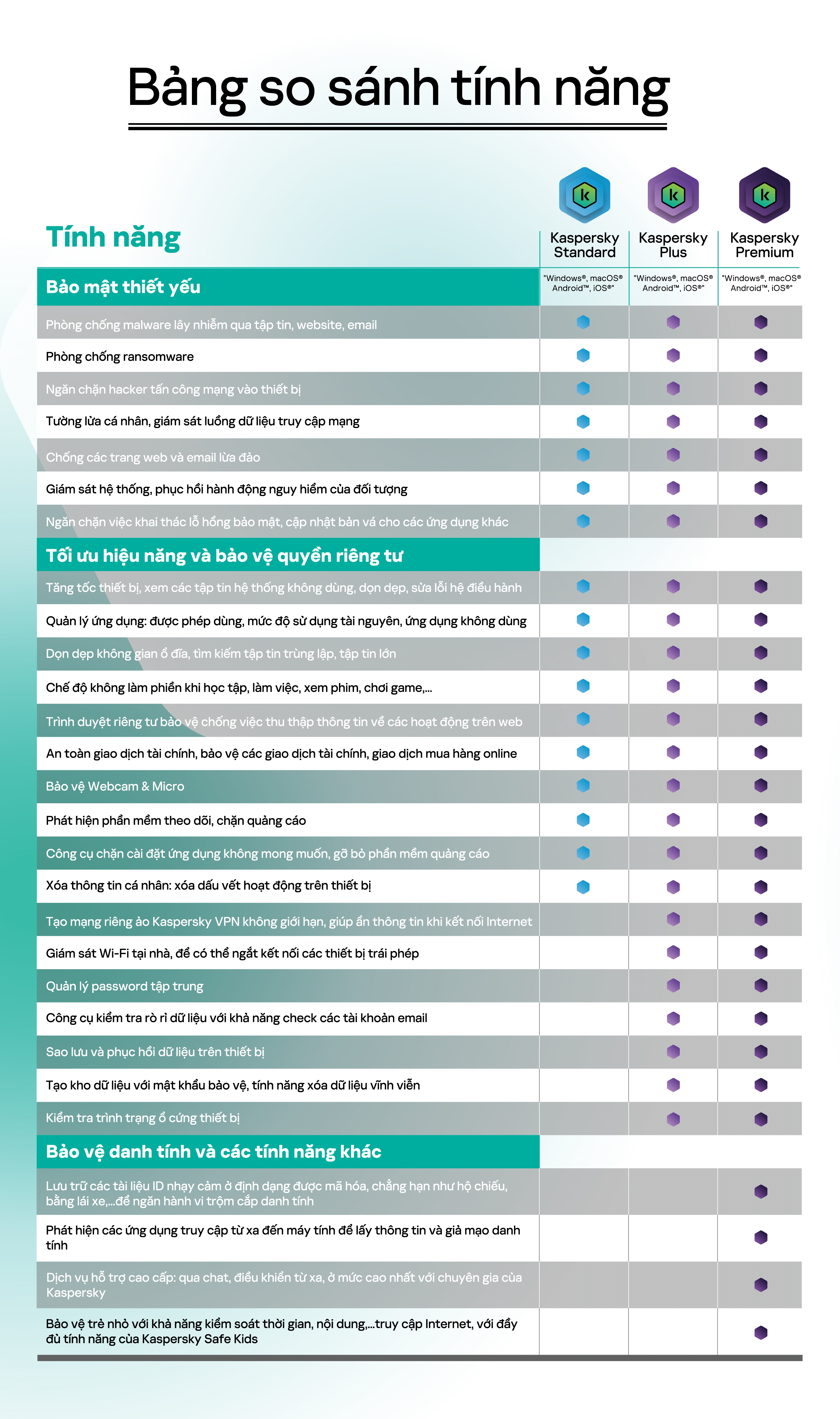 Kaspersky Standard Tương thích với: "Windows, macOS,Android, iOS" Bảo mật thiết yếu - Phòng chống malware lây nhiễm qua tập tin, website - Phòng chống ransomware - Ngăn chặn tấn công mạng vào máy tính