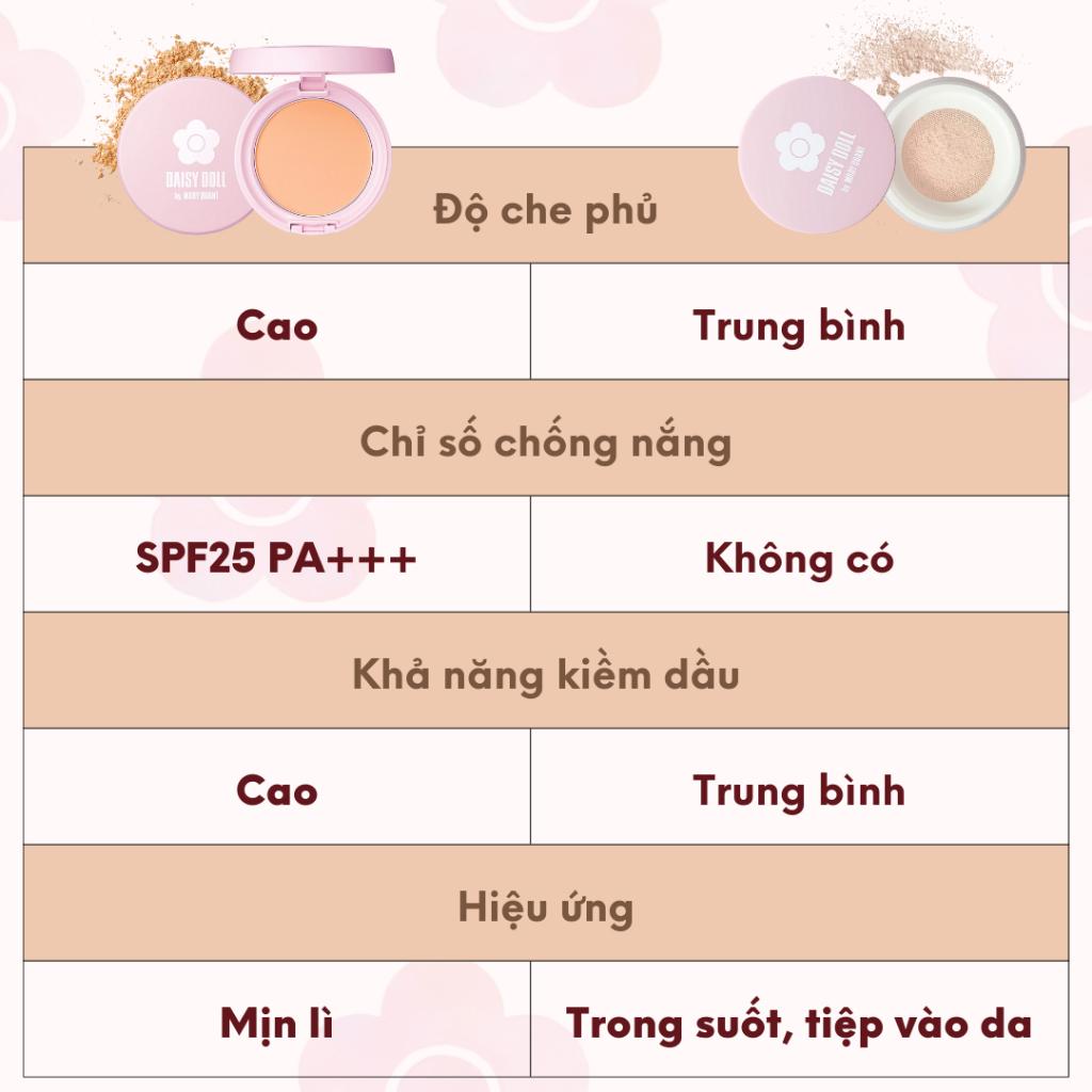 VÌ SAO BẠN SẼ CHỌN PHẦN PHỦ DẠNG NÉN DAISY DOLL? Phấn có khả năng bám da tốt, duy trì lớp trang điểm trong nhiều giờ. Lớp nền khó vỡ nhưng trông không có cảm giác dày cộm. Giúp làn da của bạ...