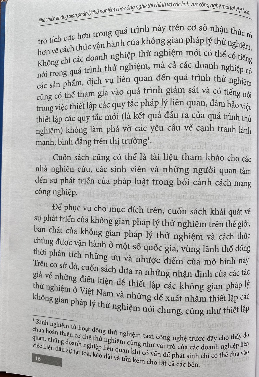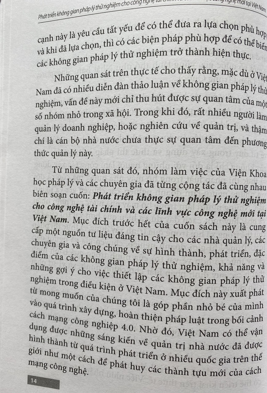Từ những quan sát đó, nhóm làm việc của Viện Khoa học pháp lý và các chuyên gia từng cộng tác đã cùng nhau biên soạn cuốn sách: Phát triển không gian pháp lý thử nghiệm (Regulatory Sandbox) cho FinTech và các lĩnh vực công nghệ mới tại Việt Nam. Mục đích trước hết của cuốn sách này là cung cấp một nguồn tư liệu đáng tin cậy cho những người quản lý, các chuyên gia và công chúng về sự hình thành, phát triển, đặc điểm của các không gian pháp lý thử nghiệm, khả năng và những gợi ý cho việc thiết lập các không gian pháp lý thử nghiệm trong điều kiện ở Việt Nam. Mục đích này xuất phát từ mong muốn của chúng tôi là góp phần nhỏ bé của mình vào quá trình xây dựng, hoàn thiện pháp luật trong bối cảnh CMCN 4.0. Nhờ đó, Việt Nam có thể tận dụng được những sáng kiến về quản trị nhà nước đã được hình thành từ quá trình phát triển ở nhiều quốc gia trên thế giới như một cách để tận dụng được những thành tựu mới của cuộc cách mạng công nghệ.