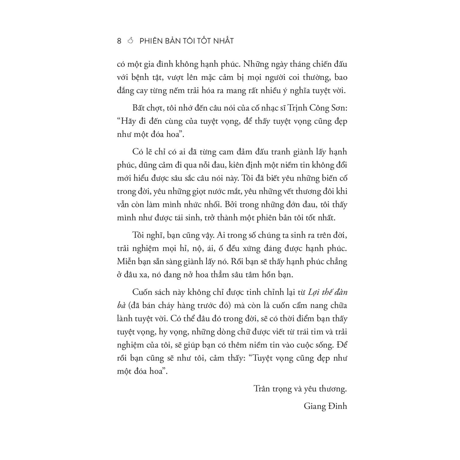 - Nếu bạn là nam giới, khi cầm trên tay cuốn sách này, bạn cũng sẽ tìm được điều gì đó thú vị, thay đổi góc nhìn của bạn, phá vỡ những định kiến quen thuộc. TÓM TẮT SÁCH Phiên bản tôi tốt nhất, được tinh chỉnh từ cuốn Lợi thế đàn bà, đổi mới và bổ sung rất nhiều nội dung giá trị, dù vẫn bám vào những câu chuyện, bài học xoay quanh người phụ nữ, nhưng nó không hẳn chỉ dành riêng cho phụ nữ. Phiên bản tôi tốt nhất dành cho bất kỳ ai muốn tìm thấy chính mình, hiểu rằng mình là người duy nhất chịu trách nhiệm cho mọi thứ đến với mình trong đời, nỗ lực để hoàn thiện mình mỗi ngày. Như mọi cuốn sách khác của Giang Đinh, Phiên bản tôi tốt nhất hướng đến thay đổi tư duy. Bởi thay đổi tư duy, bao giờ cũng thế, chính là thay đổi cuộc đời! CUỐN SÁCH CÓ GÌ ĐẶC BIỆT