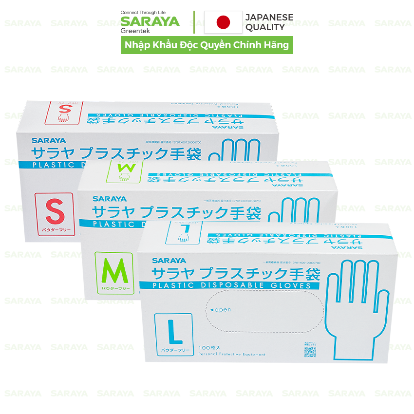 Thương hiệu: SARAYA.Xuất xứ thương hiệu: NHẬT BẢN.Xuất xứ: Trung Quốc.Quy cách đóng gói: 100 cái/ hộp, 10 hộp/ thùng.Đặc tính & công dụng sản phẩm: Dày, Không mùi, Không bột, Không chứa Latex....