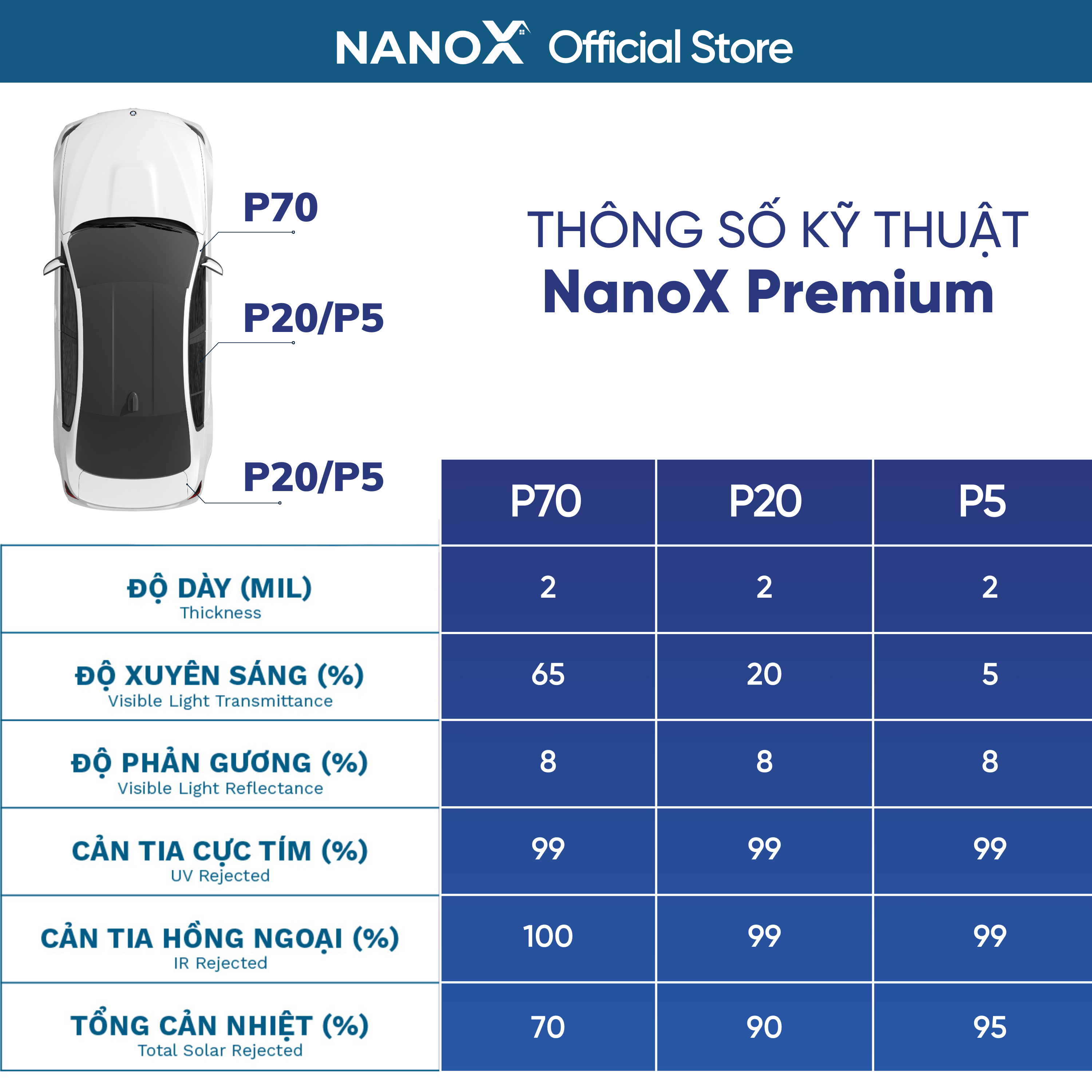 - NanoX Standard: Kính lái là công nghệ Nano Ceramic, kính sườn/hậu là công nghệ Dyed NanoX cam kết: