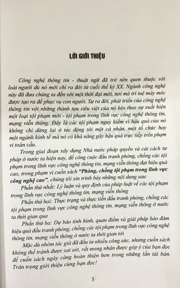 Trong giai đoạn xây dựng nhà nước pháp quyền và cải cách tư pháp ở nước ta hiện nay, để công cuộc đấu tranh phòng, chống các tội phạm trong lĩnh vực công nghệ thông tin, mang viễn thông đạt hiệu quả cao, trong phạm vi cuốn sách: “Phòng, chống tội phạm trong lĩnh vực công nghệ cao” gồm các nội dung sau: