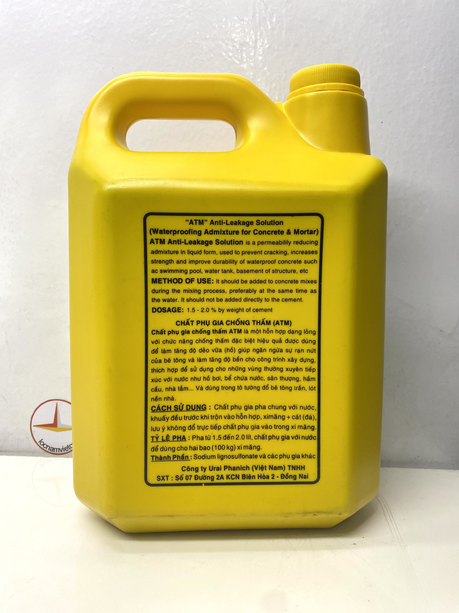 Mua tại TiktokPHỤ GIA CHỐNG THẤM ATM Là một hỗn hợp dạng lỏng với chức năng chống thấm đặc biệt hiệu quả được dùng để làm tăng độ dẻo vữa (hồ) giúp ngăn ngừa sự rạn nứt của bê tông(phụ gia ATM sẽ phá các bọt khí trong bê tông) và làm tăng độ bền cho công trình xây dựng. Sản phẩm thích hợp để sử dụng cho những vùng thường xuyên tiếp xúc với nước như hồ bơi, bể chứa nước, sân thượng, hầm cầu, nhà tắm, Và dùng trong tô tường đổ bê tông trần, lót nền nhà. TỶ LỆ PHA CÁCH SỬ DỤNG: Chất pha chung với nước và khuấy đều trước khi trộn vào hỗn hợp, xi măng + cát (đá). Lưu Ý: Không đổ trực tiếp chất phụ gia vào trong xi măng sẽ làm chín xi măng. Pha từ 1.5 đến 2.0 lít chất phụ gia với nước để dùng cho 2 bao (100 kg) xi măng. Thể tích thực: 4,5 lít Màu sắc: Đen
