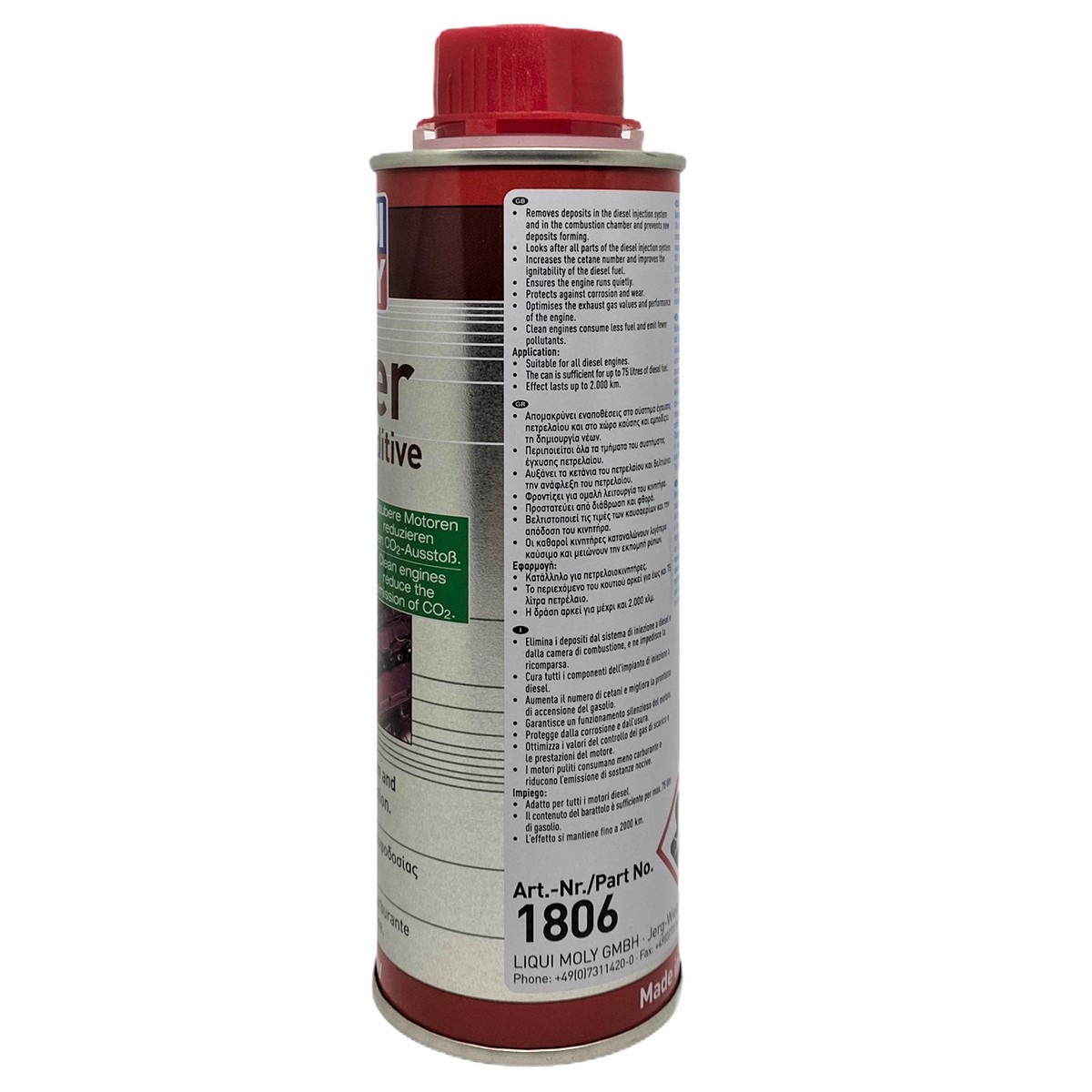 Giới thiệu Phụ gia xúc béc dầu cao cấp Liqui Moly 1806/8366 Phụ gia xúc béc xăng cao cấp Liqui Moly 1803/8366 được tổng hợp từ các chất có hiệu lực làm sạch và bảo vệ tối ưu cho hệ thống dầu. Sản phẩm được sản xuất theo tiêu chuẩn kỹ thuật tiên tiến nhất về nhiên liệu, phụ gia và đáp ứng được nhu cầu của các động cơ, thiết bị vận hành ngày nay.