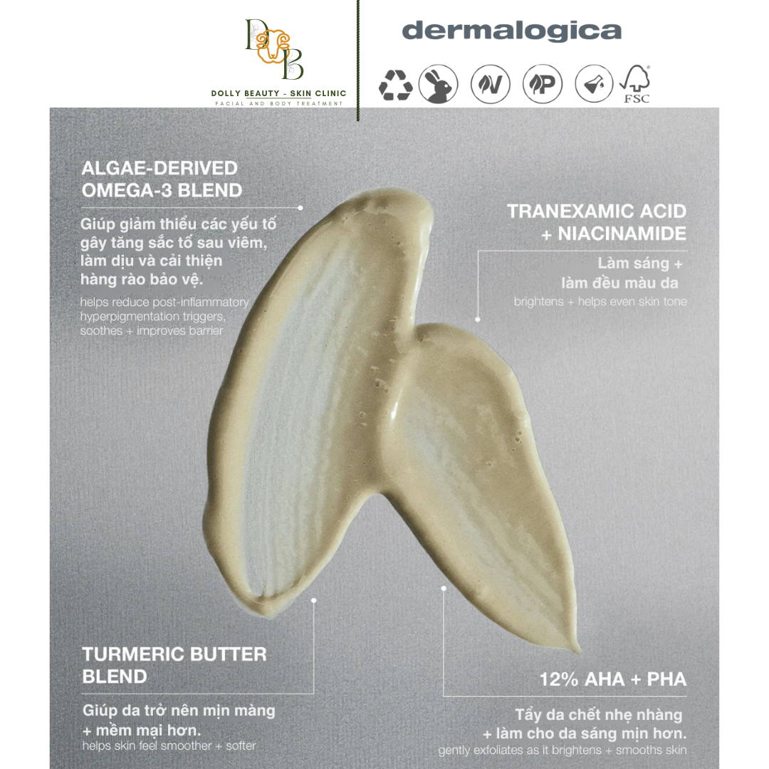 - Tông màu da không đồng đều Làm sáng rõ các vết thâm chỉ sau 5 lần sử dụng: sản phẩm tẩy tế bào chết tại nhà này giúp làm sáng bề mặt sắc tố da, bao gồm các vết thâm do tác động của UV, dấu hiệu sau mụn và nám da cho nhiều tông màu da khác nhau. Công thức tác động nhanh với sự kết hợp AHA + PHA, bao gồm Axit Mandelic, giúp nhanh chóng loại bỏ vẻ ngoài của sắc tố da cứng đầu, trong khi Axit Tranexamic và Niacinamide giúp làm đều màu da. Sự kết hợp Omega-3 phục hồi hàng rào bảo vệ, chiết xuất từ tảo, làm dịu da và giúp giảm các tác nhân dẫn đến tăng sắc tố sau viêm. Sự kết hợp bơ nghệ giàu chất chống oxy hóa nuôi dưỡng giúp làn da cảm thấy mịn màng và mềm mại hơn. LỢI ÍCH: