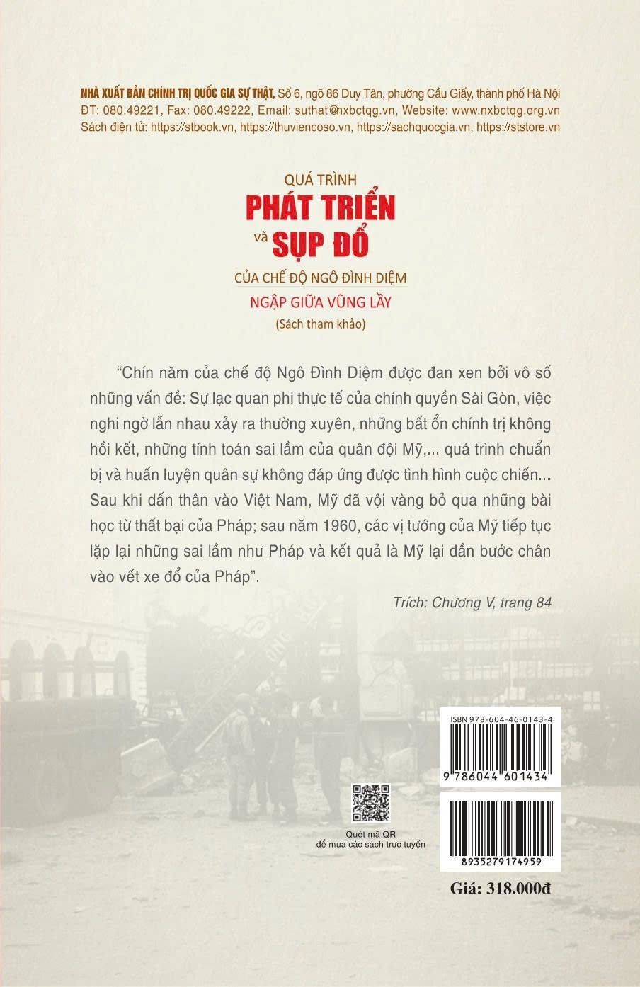 Mua tại TiktokCuốn sách "Quá trình phát triển và sụp đổ của chế độ Ngô Đình Diệm – Ngập giữa vũng lầy" của David Halberstam là tác phẩm ghi lại những gì tác giả chứng kiến tại miền Nam Việt Nam (1963–1964). Sách tái hiện sự hình thành, phát triển và sụp đổ của chế độ Ngô Đình Diệm, phân tích tình hình chính trị – xã hội Việt Nam sau khi Mỹ thay chân Pháp, đồng thời phản ánh sự bế tắc của Mỹ trong cuộc chiến. Với góc nhìn khách quan và ngòi bút phản chiến mạnh mẽ, Halberstam khẳng định Mỹ không thể khuất phục được tinh thần đấu tranh của nhân dân Việt Nam và coi đây là một cuộc chiến phi nghĩa, tốn kém, đẫm máu.