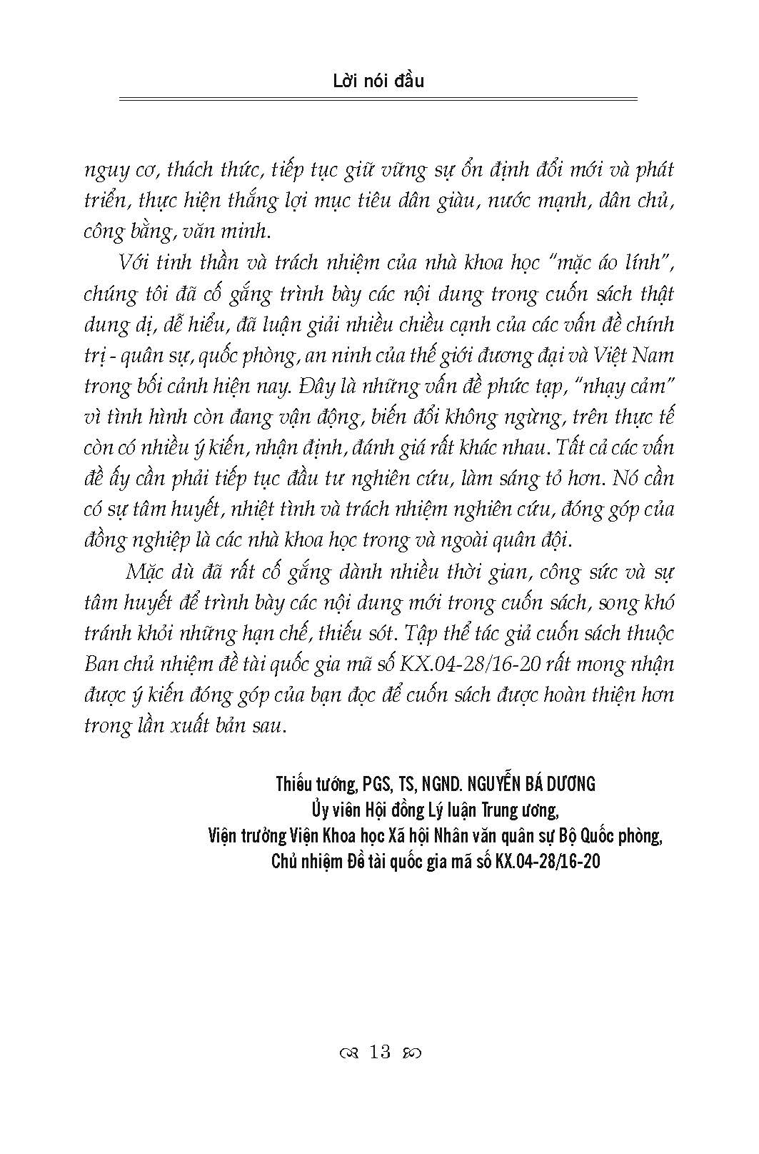 Cuốn sách trình bày những vấn đề cơ bản nhất của cuộc cách mạng khoa học và công nghệ hiện đại, kinh tế tri thức và toàn cầu hóa; quan hệ giữa chủ nghĩa xã hội và chủ nghĩa tư bản; chiến tranh và xung đột quân sự trong thế giới đương đại; các nước lớn và cạnh tranh chiến lược giữa các nước lớn, đặc biệt là sự cạnh tranh chiến lược giữa Mỹ và Trung Quốc ở Đông Nam Á; các vấn đề an ninh phi truyền thống. Trên cơ sở đó, cuốn sách trình bày rõ quan điểm của Đảng, chính sách của Nhà nước ta về các đối sách: Về hội nhập uốc tế, xây dựng thực lực mạnh; kế sách giữ nước; bảo vệ Tổ quốc xã hội chủ nghĩa; kết hợp xây dựng và bảo vệ Tổ quốc…
