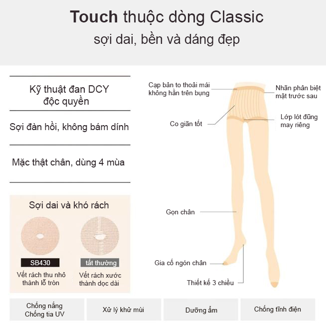 Quần tất không rách. Công nghệ dệt sợi NISSHINBO của Nhật Bản giúp sợi vải co giãn, chống rút sợi khi bị xước. Thiết kế 3D ôm sát cơ thể, đặc biệt các sợi làm