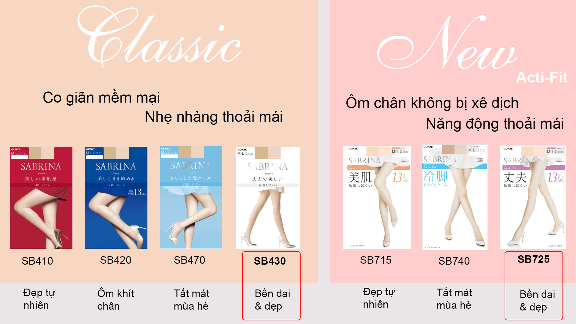 Quần tất mỏng sử dụng quanh năm thương hiệu Sabrina của Gunze sẽ có 2 dòng sản phẩm chính hiện vẫn đang được sản xuất và tiêu thụ lớn ở thị trường nội địa Nhật Bản bao gồm: