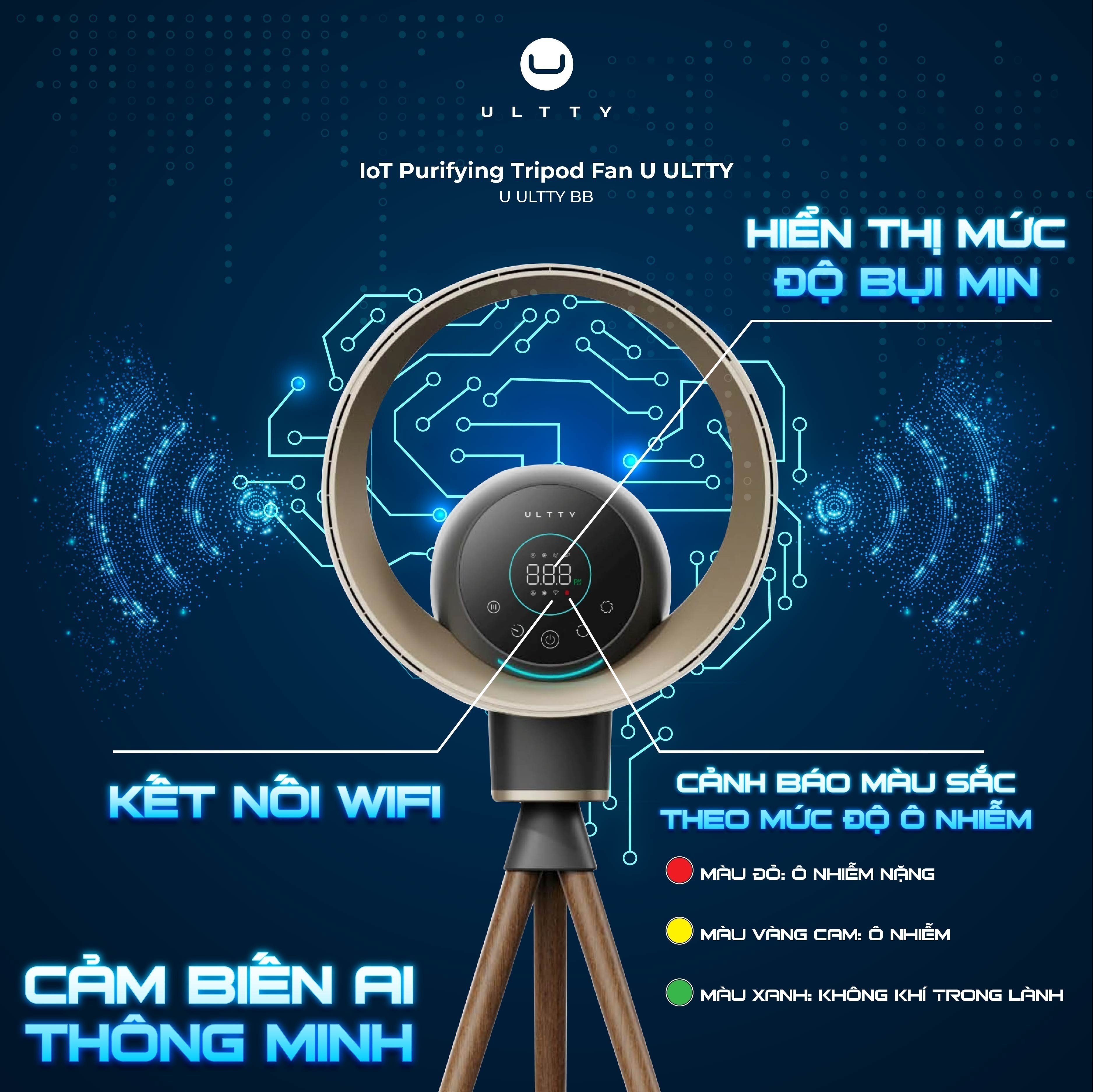 ULTTY BB sử dụng đèn khí quyển học vòng tròn bo xung quanh viền quạt. Giúp thẩm Mỹ sang trọng, đồng thời kết hợp làm đèn ngủ, đen trang trí, sử dụng hoàn toàn độc lập với các chức năng khác